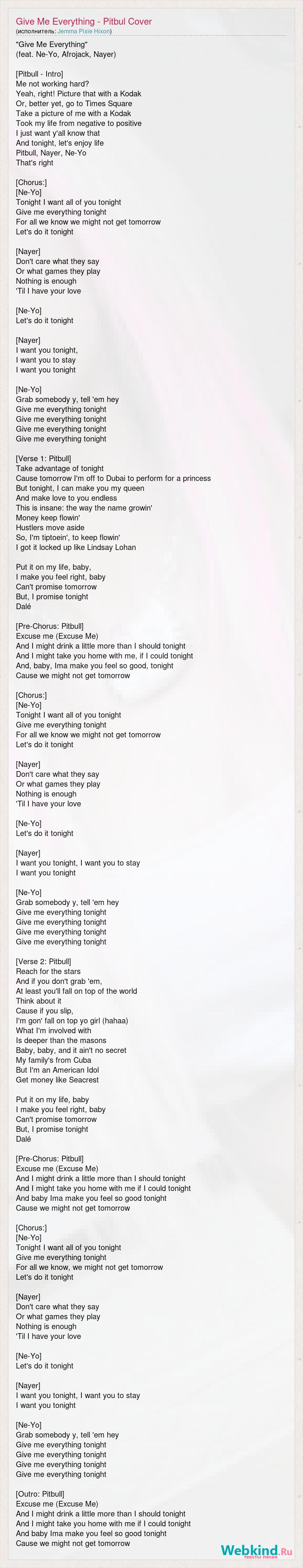 "Give Me Everything" (feat. Ne-Yo, Afrojack, Nayer) [Pitbull - Intro] Me not working hard? Yeah, right! Picture that with a Kodak Or, better yet, go to Times Square Take a picture of me with a Kodak Took my life from negative to positive I just want y'all know that And tonight, let's enjoy life Pitbull, Nayer, Ne-Yo That's right [Chorus:] [Ne-Yo] Tonight I want all of you tonight Give me everything tonight For all we know we might not get tomorrow Let's do it tonight [Nayer] Don't care what they say Or what games they play Nothing is enough 'Til I have your love [Ne-Yo] Let's do it tonight [Nayer] I want you tonight, I want you to stay I want you tonight [Ne-Yo] Grab somebody y, tell 'em hey Give me everything tonight Give me everything tonight Give me everything tonight Give me everything tonight [Verse 1: Pitbull] Take advantage of tonight Cause tomorrow I'm off to Dubai to perform for a princess But tonight, I can make you my queen And make love to you endless This is insane: the way the name growin' Money keep flowin' Hustlers move aside So, I'm tiptoein', to keep flowin' I got it locked up like Lindsay Lohan Put it on my life, baby, I make you feel right, baby Can't promise tomorrow But, I promise tonight Dalé [Pre-Chorus: Pitbull] Excuse me (Excuse Me) And I might drink a little more than I should tonight And I might take you home with me, if I could tonight And, baby, Ima make you feel so good, tonight Cause we might not get tomorrow [Chorus:] [Ne-Yo] Tonight I want all of you tonight Give me everything tonight For all we know we might not get tomorrow Let's do it tonight [Nayer] Don't care what they say Or what games they play Nothing is enough 'Til I have your love [Ne-Yo] Let's do it tonight [Nayer] I want you tonight, I want you to stay I want you tonight [Ne-Yo] Grab somebody y, tell 'em hey Give me everything tonight Give me everything tonight Give me everything tonight Give me everything tonight [Verse 2: Pitbull] Reach for the stars And if you don't grab 'em, At least you'll fall on top of the world Think about it Cause if you slip, I'm gon' fall on top yo girl (hahaa) What I'm involved with Is deeper than the masons Baby, baby, and it ain't no secret My family's from Cuba But I'm an American Idol Get money like Seacrest Put it on my life, baby I make you feel right, baby Can't promise tomorrow But, I promise tonight Dalé [Pre-Chorus: Pitbull] Excuse me (Excuse Me) And I might drink a little more than I should tonight And I might take you home with me if I could tonight And baby Ima make you feel so good tonight Cause we might not get tomorrow [Chorus:] [Ne-Yo] Tonight I want all of you tonight Give me everything tonight For all we know, we might not get tomorrow Let's do it tonight [Nayer] Don't care what they say Or what games they play Nothing is enough 'Til I have your love [Ne-Yo] Let's do it tonight [Nayer] I want you tonight, I want you to stay I want you tonight [Ne-Yo] Grab somebody y, tell 'em hey Give me everything tonight Give me everything tonight Give me everything tonight Give me everything tonight [Outro: Pitbull] Excuse me (Excuse Me) And I might drink a little more than I should tonight And I might take you home with me if I could tonight And baby Ima make you feel so good tonight Cause we might not get tomorrow