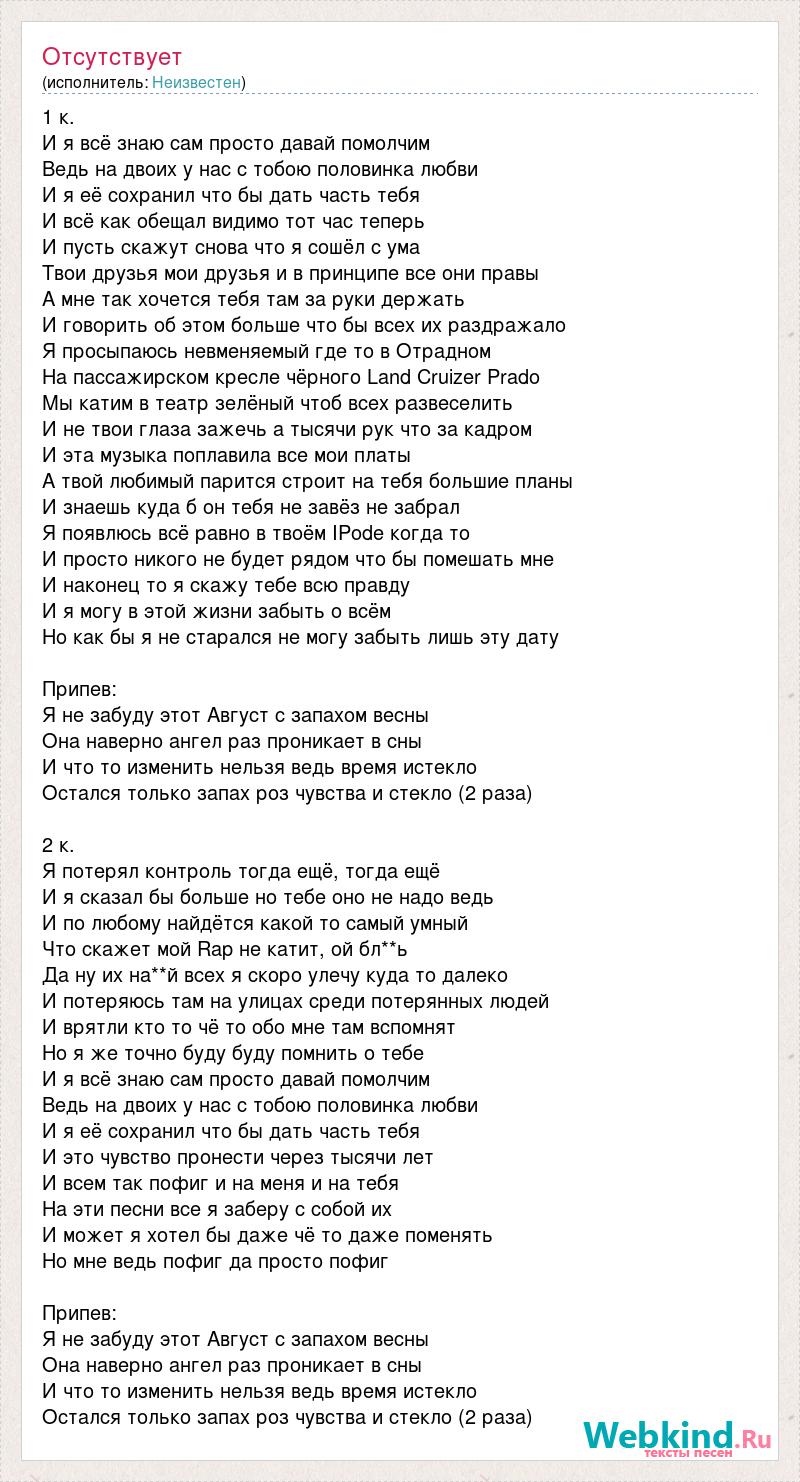 1 к. И я всё знаю сам просто давай помолчим Ведь на двоих у нас с тобою половинка любви И я её сохранил что бы дать часть тебя И всё как обещал видимо тот час теперь И пусть скажут снова что я сошёл с ума Твои друзья мои друзья и в принципе все они правы А мне так хочется тебя там за руки держать И говорить об этом больше что бы всех их раздражало Я просыпаюсь невменяемый где то в Отрадном На пассажирском кресле чёрного Land Cruizer Prado Мы катим в театр зелёный чтоб всех развеселить И не твои глаза зажечь а тысячи рук что за кадром И эта музыка поплавила все мои платы А твой любимый парится строит на тебя большие планы И знаешь куда б он тебя не завёз не забрал Я появлюсь всё равно в твоём IPode когда то И просто никого не будет рядом что бы помешать мне И наконец то я скажу тебе всю правду И я могу в этой жизни забыть о всём Но как бы я не старался не могу забыть лишь эту дату Припев: Я не забуду этот Август с запахом весны Она наверно ангел раз проникает в сны И что то изменить нельзя ведь время истекло Остался только запах роз чувства и стекло (2 раза) 2 к. Я потерял контроль тогда ещё, тогда ещё И я сказал бы больше но тебе оно не надо ведь И по любому найдётся какой то самый умный Что скажет мой Rap не катит, ой бл**ь Да ну их на**й всех я скоро улечу куда то далеко И потеряюсь там на улицах среди потерянных людей И врятли кто то чё то обо мне там вспомнят Но я же точно буду буду помнить о тебе И я всё знаю сам просто давай помолчим Ведь на двоих у нас с тобою половинка любви И я её сохранил что бы дать часть тебя И это чувство пронести через тысячи лет И всем так пофиг и на меня и на тебя На эти песни все я заберу с собой их И может я хотел бы даже чё то даже поменять Но мне ведь пофиг да просто пофиг Припев: Я не забуду этот Август с запахом весны Она наверно ангел раз проникает в сны И что то изменить нельзя ведь время истекло Остался только запах роз чувства и стекло (2 раза)