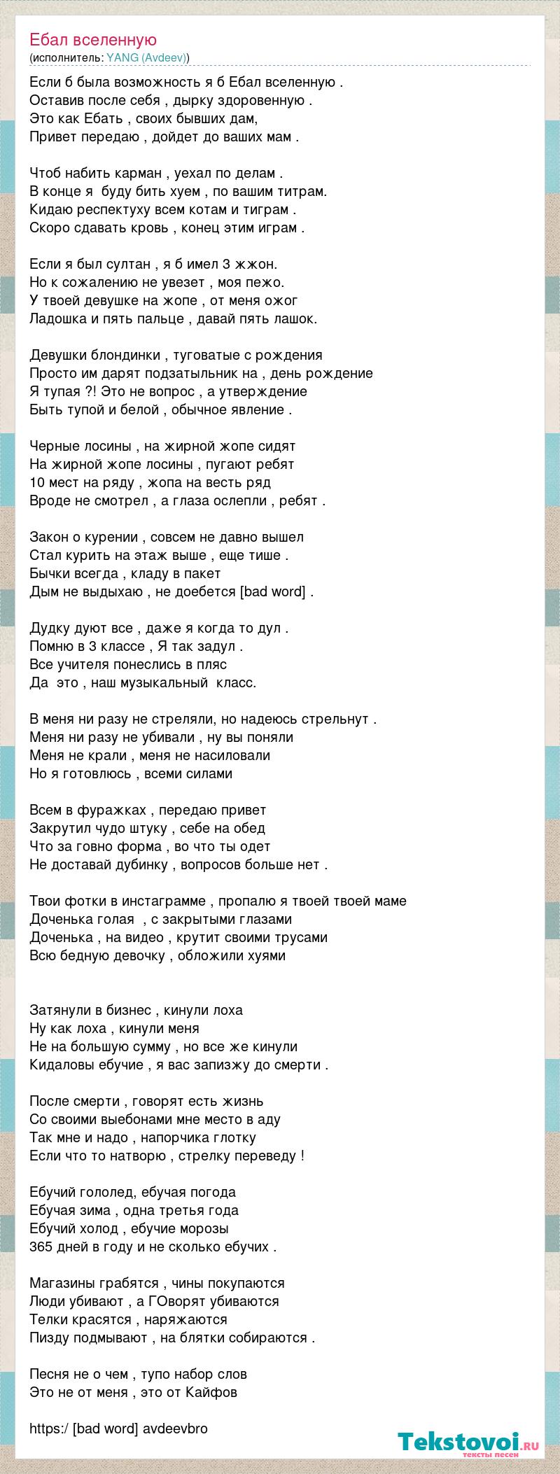 Если б была возможность я б Ебал вселенную . Оставив после себя , дырку здоровенную . Это как Ебать , своих бывших дам, Привет передаю , дойдет до ваших мам . Чтоб набить карман , уехал по делам . В конце я буду бить хуем , по вашим титрам. Кидаю респектуху всем котам и тиграм . Скоро сдавать кровь , конец этим играм . Если я был султан , я б имел 3 жжон. Но к сожалению не увезет , моя пежо. У твоей девушке на жопе , от меня ожог Ладошка и пять пальце , давай пять лашок. Девушки блондинки , туговатые с рождения Просто им дарят подзатыльник на , день рождение Я тупая ?! Это не вопрос , а утверждение Быть тупой и белой , обычное явление . Черные лосины , на жирной жопе сидят На жирной жопе лосины , пугают ребят 10 мест на ряду , жопа на весть ряд Вроде не смотрел , а глаза ослепли , ребят . Закон о курении , совсем не давно вышел Стал курить на этаж выше , еще тише . Бычки всегда , кладу в пакет Дым не выдыхаю , не доебется [bad word] . Дудку дуют все , даже я когда то дул . Помню в 3 классе , Я так задул . Все учителя понеслись в пляс Да это , наш музыкальный класс. В меня ни разу не стреляли, но надеюсь стрельнут . Меня ни разу не убивали , ну вы поняли Меня не крали , меня не насиловали Но я готовлюсь , всеми силами Всем в фуражках , передаю привет Закрутил чудо штуку , себе на обед Что за говно форма , во что ты одет Не доставай дубинку , вопросов больше нет . Твои фотки в инстаграмме , пропалю я твоей твоей маме Доченька голая , с закрытыми глазами Доченька , на видео , крутит своими трусами Всю бедную девочку , обложили хуями Затянули в бизнес , кинули лоха Ну как лоха , кинули меня Не на большую сумму , но все же кинули Кидаловы ебучие , я вас запизжу до смерти . После смерти , говорят есть жизнь Со своими выебонами мне место в аду Так мне и надо , напорчика глотку Если что то натворю , стрелку переведу ! Ебучий гололед, ебучая погода Ебучая зима , одна третья года Ебучий холод , ебучие морозы 365 дней в году и не сколько ебучих . Магазины грабятся , чины покупаются Люди убивают , а ГОворят убиваются Телки красятся , наряжаются Пизду подмывают , на блятки собираются . Песня не о чем , тупо набор слов Это не от меня , это от Кайфов https:/ [bad word] avdeevbro