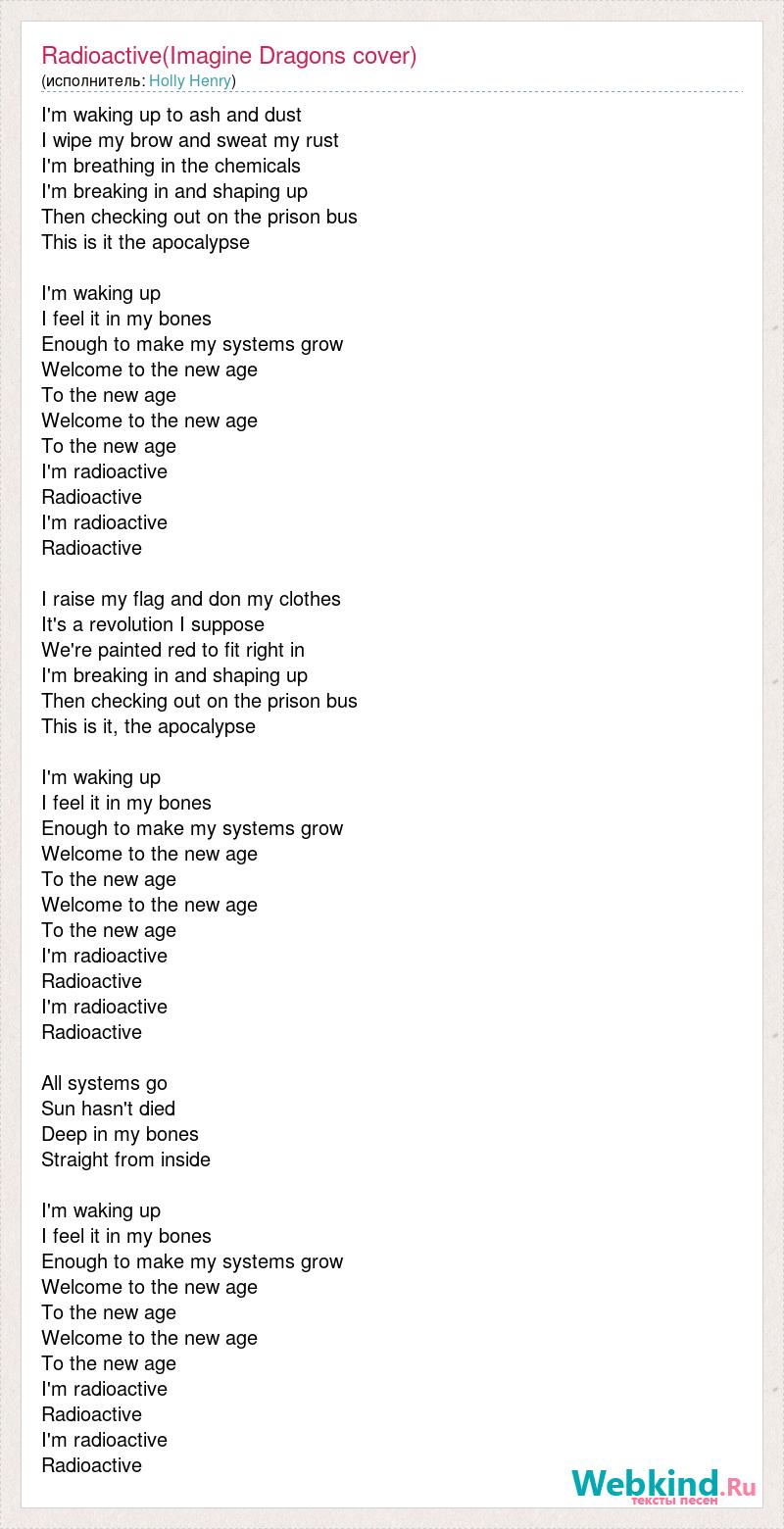 I'm waking up to ash and dust I wipe my brow and sweat my rust I'm breathing in the chemicals I'm breaking in and shaping up Then checking out on the prison bus This is it the apocalypse I'm waking up I feel it in my bones Enough to make my systems grow Welcome to the new age To the new age Welcome to the new age To the new age I'm radioactive Radioactive I'm radioactive Radioactive I raise my flag and don my clothes It's a revolution I suppose We're painted red to fit right in I'm breaking in and shaping up Then checking out on the prison bus This is it, the apocalypse I'm waking up I feel it in my bones Enough to make my systems grow Welcome to the new age To the new age Welcome to the new age To the new age I'm radioactive Radioactive I'm radioactive Radioactive All systems go Sun hasn't died Deep in my bones Straight from inside I'm waking up I feel it in my bones Enough to make my systems grow Welcome to the new age To the new age Welcome to the new age To the new age I'm radioactive Radioactive I'm radioactive Radioactive