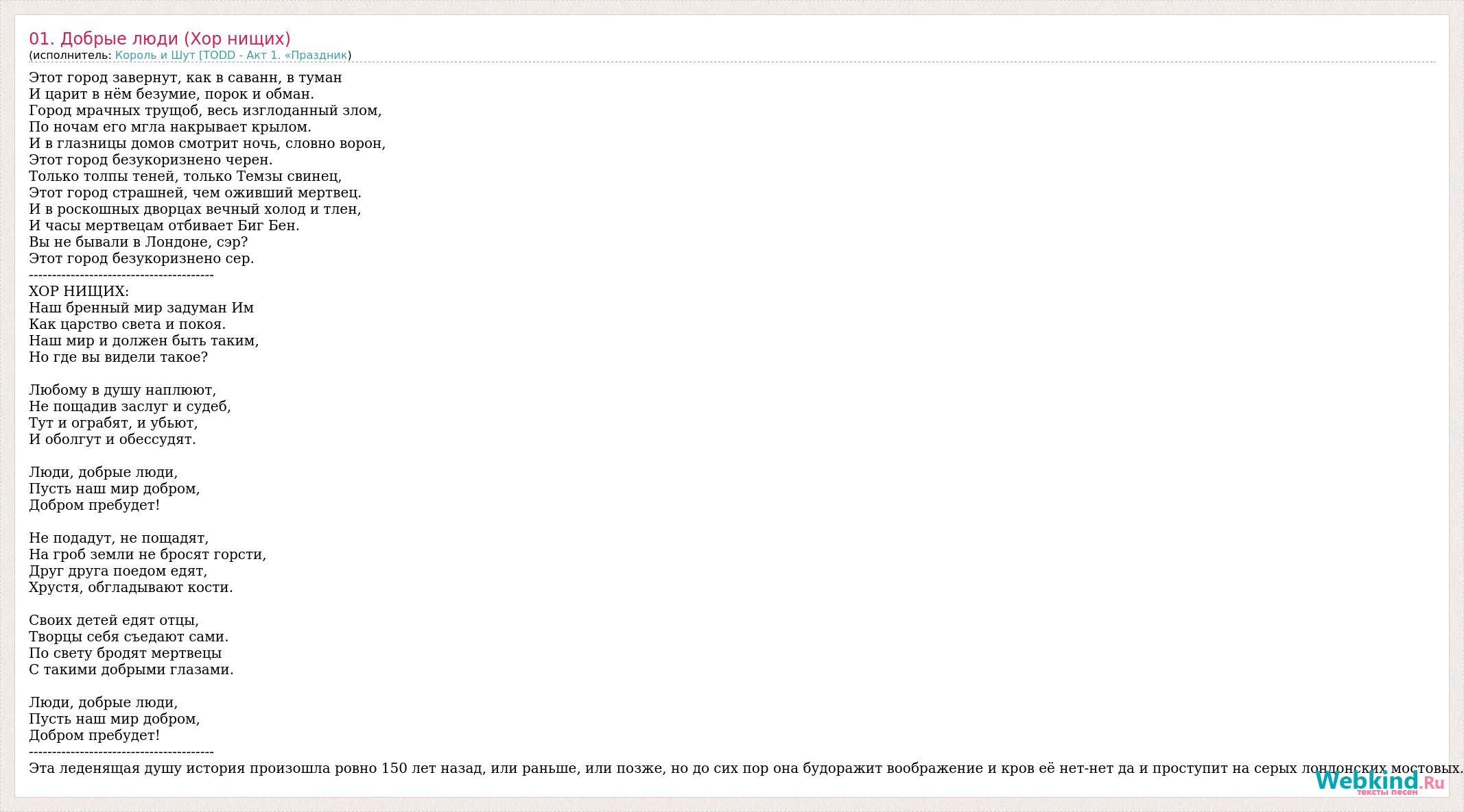 Этот город завернут, как в саванн, в туман И царит в нём безумие, порок и обман. Город мрачных трущоб, весь изглоданный злом, По ночам его мгла накрывает крылом. И в глазницы домов смотрит ночь, словно ворон, Этот город безукоризнено черен. Только толпы теней, только Темзы свинец, Этот город страшней, чем оживший мертвец. И в роскошных дворцах вечный холод и тлен, И часы мертвецам отбивает Биг Бен. Вы не бывали в Лондоне, сэр? Этот город безукоризнено сер. ---------------------------------------- ХОР НИЩИХ: Наш бренный мир задуман Им Как царство света и покоя. Наш мир и должен быть таким, Но где вы видели такое? Любому в душу наплюют, Не пощадив заслуг и судеб, Тут и ограбят, и убьют, И оболгут и обессудят. Люди, добрые люди, Пусть наш мир добром, Добром пребудет! Не подадут, не пощадят, На гроб земли не бросят горсти, Друг друга поедом едят, Хрустя, обгладывают кости. Своих детей едят отцы, Творцы себя съедают сами. По свету бродят мертвецы С такими добрыми глазами. Люди, добрые люди, Пусть наш мир добром, Добром пребудет! ---------------------------------------- Эта леденящая душу история произошла ровно 150 лет назад, или раньше, или позже, но до сих пор она будоражит воображение и кров её нет-нет да и проступит на серых лондонских мостовых.