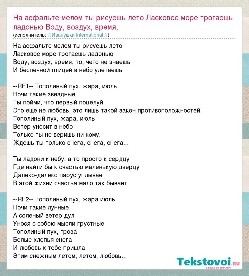 На асфальте мелом ты рисуешь лето Ласковое море трогаешь ладонью Воду, воздух, время, то, чего не знаешь И беспечной птицей в небо улетаешь --RF1-- Тополиный пух, жара, июль Ночи такие звездные Ты пойми, что первый поцелуй Это еще не любовь, это лишь такой закон противоположностей Тополиный пух, жара, июль Ветер уносит в небо Только ты не веришь ни кому. Ждешь ты только снега, снега, снега... Ты ладони к небу, а то просто к сердцу Где найти бы к счастью маленькую дверцу Далеко-далеко парус уплывает В этой жизни счастья мало так бывает --RF2-- Тополиный пух, жара июль Ночи такие лунные А соленый ветер дул Унося с собою мысли грустные Тополиный пух, гроза Белые хлопья снега И любовь к тебе пришла Этим снежным летом, летом, любовь...