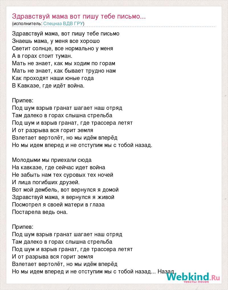 Здравствуй мама, вот пишу тебе письмо Знаешь мама, у меня все хорошо Светит солнце, все нормально у меня А в горах стоит туман. Мать не знает, как мы ходим по горам Мать не знает, как бывает трудно нам Как проходят наши юные года В Кавказе, где идёт война. Припев: Под шум взрыв гранат шагает наш отряд Там далеко в горах слышна стрельба Под шум и взрыв гранат, где трассера летят И от разрыва вся горит земля Взлетает вертолёт, но мы идём вперёд Но мы идем вперед и не отступим мы с тобой назад. Молодыми мы приехали сюда На кавказе, где сейчас идет война Не забыть нам тех суровых тех ночей И лица погибших друзей. Вот мой дембель, вот вернулся я домой Здравствуй мама, я вернулся я живой Посмотрел я своей матери в глаза Постарела ведь она. Припев: Под шум взрыв гранат шагает наш отряд Там далеко в горах слышна стрельба Под шум и взрыв гранат, где трассера летят И от разрыва вся горит земля Взлетает вертолёт, но мы идём вперёд Но мы идем вперед и не отступим мы с тобой назад... Назад
