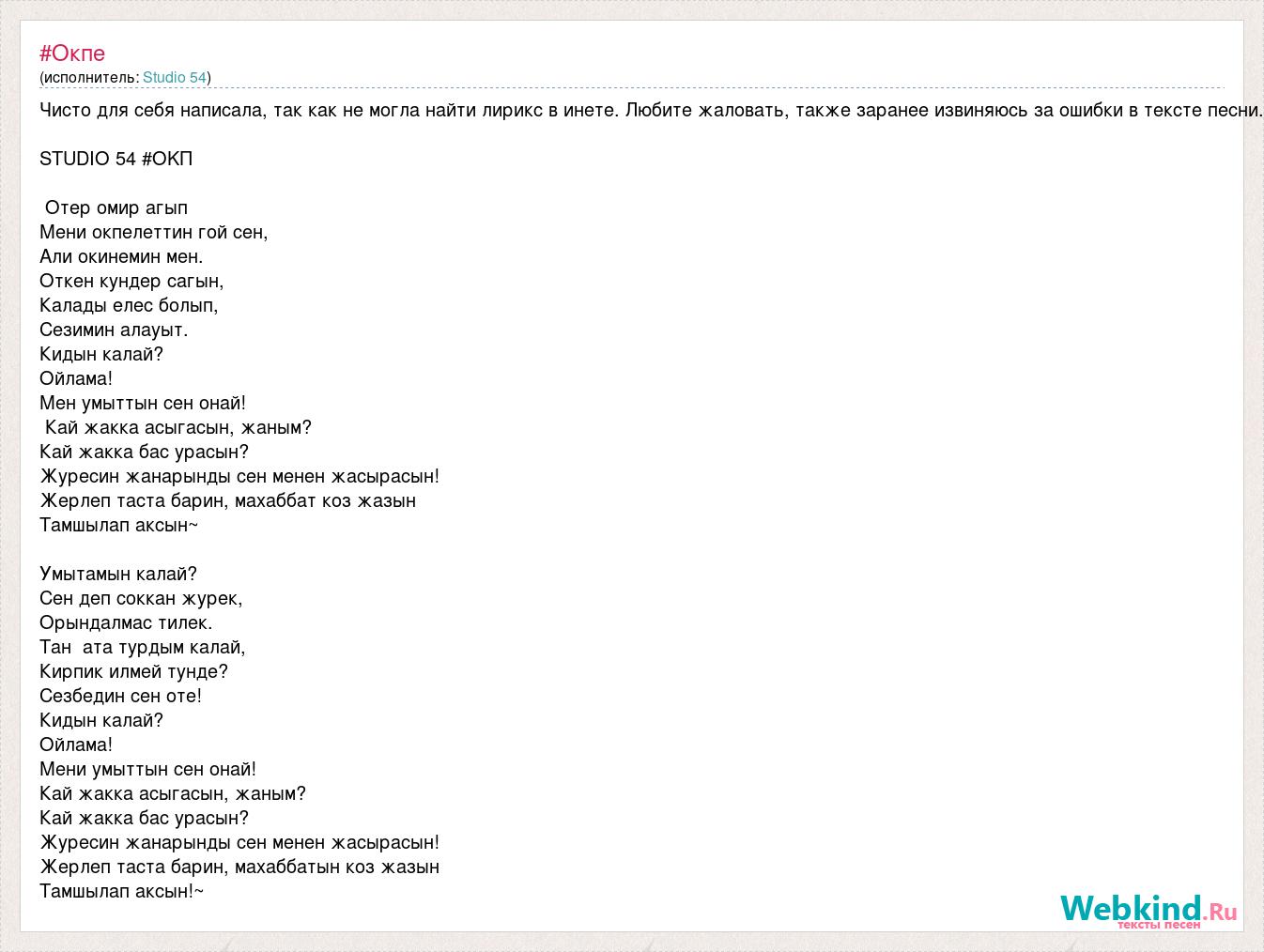 Чисто для себя написала, так как не могла найти лирикс в инете. Любите жаловать, также заранее извиняюсь за ошибки в тексте песни. STUDIO 54 #OKП Отер омир агып Мени окпелеттин гой сен, Али окинемин мен. Откен кундер сагын, Калады елес болып, Сезимин алауыт. Кидын калай? Ойлама! Мен умыттын сен онай! Кай жакка асыгасын, жаным? Кай жакка бас урасын? Журесин жанарынды сен менен жасырасын! Жерлеп таста барин, махаббат коз жазын Тамшылап аксын~ Умытамын калай? Сен деп соккан журек, Орындалмас тилек. Тан ата турдым калай, Кирпик илмей тунде? Сезбедин сен оте! Кидын калай? Ойлама! Мени умыттын сен онай! Кай жакка асыгасын, жаным? Кай жакка бас урасын? Журесин жанарынды сен менен жасырасын! Жерлеп таста барин, махаббатын коз жазын Тамшылап аксын!~