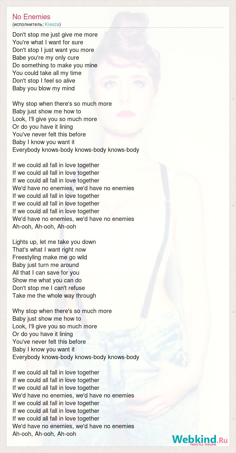 Don't stop me just give me more You're what I want for sure Don't stop I just want you more Babe you're my only cure Do something to make you mine You could take all my time Don't stop I feel so alive Baby you blow my mind Why stop when there's so much more Baby just show me how to Look, I'll give you so much more Or do you have it lining You've never felt this before Baby I know you want it Everybody knows-body knows-body knows-body If we could all fall in love together If we could all fall in love together If we could all fall in love together We'd have no enemies, we'd have no enemies If we could all fall in love together If we could all fall in love together If we could all fall in love together We'd have no enemies, we'd have no enemies Ah-ooh, Ah-ooh, Ah-ooh Lights up, let me take you down That's what I want right now Freestyling make me go wild Baby just turn me around All that I can save for you Show me what you can do Don't stop me I can't refuse Take me the whole way through Why stop when there's so much more Baby just show me how to Look, I'll give you so much more Or do you have it lining You've never felt this before Baby I know you want it Everybody knows-body knows-body knows-body If we could all fall in love together If we could all fall in love together If we could all fall in love together We'd have no enemies, we'd have no enemies If we could all fall in love together If we could all fall in love together If we could all fall in love together We'd have no enemies, we'd have no enemies Ah-ooh, Ah-ooh, Ah-ooh
