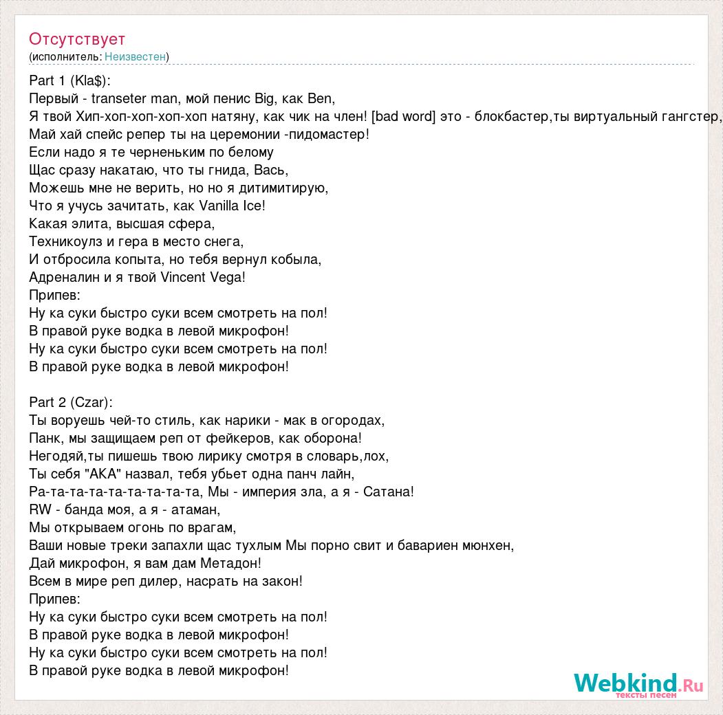 Part 1 (Kla$): Первый - transeter man, мой пенис Big, как Ben, Я твой Хип-хоп-хоп-хоп-хоп натяну, как чик на член! [bad word] это - блокбастер,ты виртуальный гангстер, Май хай спейс репер ты на церемонии -пидомастер! Если надо я те черненьким по белому Щас сразу накатаю, что ты гнида, Вась, Можешь мне не верить, но но я дитимитирую, Что я учусь зачитать, как Vanilla Ice! Какая элита, высшая сфера, Техникоулз и гера в место снега, И отбросила копыта, но тебя вернул кобыла, Адреналин и я твой Vincent Vega! Припев: Ну ка суки быстро суки всем смотреть на пол! В правой руке водка в левой микрофон! Ну ка суки быстро суки всем смотреть на пол! В правой руке водка в левой микрофон! Part 2 (Czar): Ты воруешь чей-то стиль, как нарики - мак в огородах, Панк, мы защищаем реп от фейкеров, как оборона! Негодяй,ты пишешь твою лирику смотря в словарь,лох, Ты себя "АКА" назвал, тебя убьет одна панч лайн, Ра-та-та-та-та-та-та-та-та, Мы - империя зла, а я - Сатана! RW - банда моя, а я - атаман, Мы открываем огонь по врагам, Ваши новые треки запахли щас тухлым Мы порно свит и бавариен мюнхен, Дай микрофон, я вам дам Метадон! Всем в мире реп дилер, насрать на закон! Припев: Ну ка суки быстро суки всем смотреть на пол! В правой руке водка в левой микрофон! Ну ка суки быстро суки всем смотреть на пол! В правой руке водка в левой микрофон!