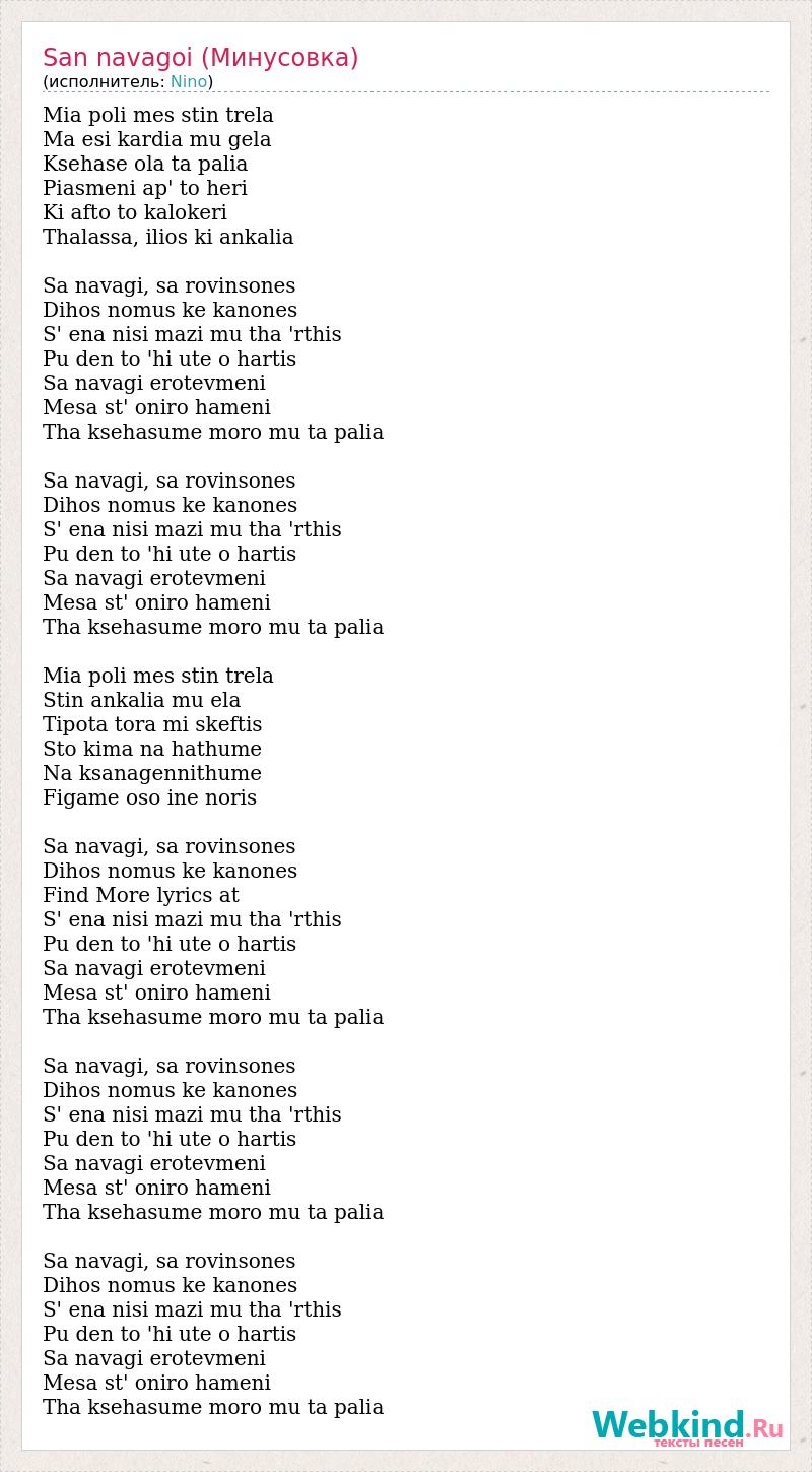 Mia poli mes stin trela Ma esi kardia mu gela Ksehase ola ta palia Piasmeni ap' to heri Ki afto to kalokeri Thalassa, ilios ki ankalia Sa navagi, sa rovinsones Dihos nomus ke kanones S' ena nisi mazi mu tha 'rthis Pu den to 'hi ute o hartis Sa navagi erotevmeni Mesa st' oniro hameni Tha ksehasume moro mu ta palia Sa navagi, sa rovinsones Dihos nomus ke kanones S' ena nisi mazi mu tha 'rthis Pu den to 'hi ute o hartis Sa navagi erotevmeni Mesa st' oniro hameni Tha ksehasume moro mu ta palia Mia poli mes stin trela Stin ankalia mu ela Tipota tora mi skeftis Sto kima na hathume Na ksanagennithume Figame oso ine noris Sa navagi, sa rovinsones Dihos nomus ke kanones Find More lyrics at S' ena nisi mazi mu tha 'rthis Pu den to 'hi ute o hartis Sa navagi erotevmeni Mesa st' oniro hameni Tha ksehasume moro mu ta palia Sa navagi, sa rovinsones Dihos nomus ke kanones S' ena nisi mazi mu tha 'rthis Pu den to 'hi ute o hartis Sa navagi erotevmeni Mesa st' oniro hameni Tha ksehasume moro mu ta palia Sa navagi, sa rovinsones Dihos nomus ke kanones S' ena nisi mazi mu tha 'rthis Pu den to 'hi ute o hartis Sa navagi erotevmeni Mesa st' oniro hameni Tha ksehasume moro mu ta palia