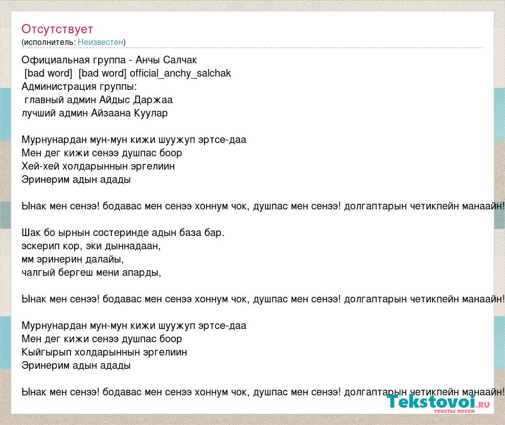 Официальная группа - Анчы Салчак [bad word] [bad word] official_anchy_salchak Администрация группы: главный админ Айдыс Даржаа лучший админ Айзаана Куулар Мурнунардан мун-мун кижи шуужуп эртсе-даа Мен дег кижи сенээ душпас боор Хей-хей холдарыннын эргелиин Эринерим адын адады Ынак мен сенээ! бодавас мен сенээ хоннум чок, душпас мен сенээ! долгаптарын четикпейн манаайн! Шак бо ырнын состеринде адын база бар. эскерип кор, эки дыннадаан, мм эринерин далайы, чалгый бергеш мени апарды, Ынак мен сенээ! бодавас мен сенээ хоннум чок, душпас мен сенээ! долгаптарын четикпейн манаайн! Мурнунардан мун-мун кижи шуужуп эртсе-даа Мен дег кижи сенээ душпас боор Кыйгырып холдарыннын эргелиин Эринерим адын адады Ынак мен сенээ! бодавас мен сенээ хоннум чок, душпас мен сенээ! долгаптарын четикпейн манаайн!