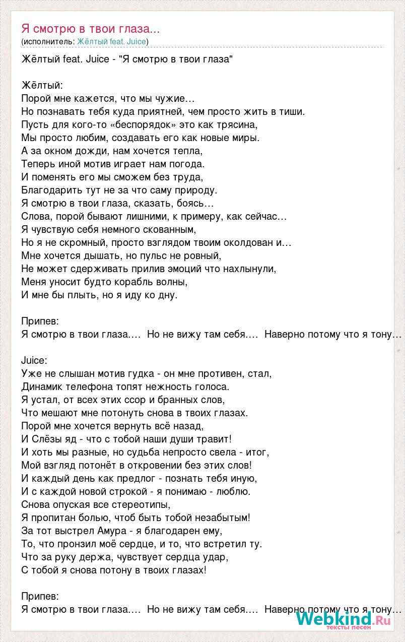 Жёлтый feat. Juice - "Я смотрю в твои глаза" Жёлтый: Порой мне кажется, что мы чужие… Но познавать тебя куда приятней, чем просто жить в тиши. Пусть для кого-то «беспорядок» это как трясина, Мы просто любим, создавать его как новые миры. А за окном дожди, нам хочется тепла, Теперь иной мотив играет нам погода. И поменять его мы сможем без труда, Благодарить тут не за что саму природу. Я смотрю в твои глаза, сказать, боясь… Слова, порой бывают лишними, к примеру, как сейчас… Я чувствую себя немного скованным, Но я не скромный, просто взглядом твоим околдован и… Мне хочется дышать, но пульс не ровный, Не может сдерживать прилив эмоций что нахлынули, Меня уносит будто корабль волны, И мне бы плыть, но я иду ко дну. Припев: Я смотрю в твои глаза.… Но не вижу там себя.… Наверно потому что я тону… Juice: Уже не слышан мотив гудка - он мне противен, стал, Динамик телефона топят нежность голоса. Я устал, от всех этих ссор и бранных слов, Что мешают мне потонуть снова в твоих глазах. Порой мне хочется вернуть всё назад, И Слёзы яд - что с тобой наши души травит! И хоть мы разные, но судьба непросто свела - итог, Мой взгляд потонёт в откровении без этих слов! И каждый день как предлог - познать тебя иную, И с каждой новой строкой - я понимаю - люблю. Снова опуская все стереотипы, Я пропитан болью, чтоб быть тобой незабытым! За тот выстрел Амура - я благодарен ему, То, что пронзил моё сердце, и то, что встретил ту. Что за руку держа, чувствует сердца удар, С тобой я снова потону в твоих глазах! Припев: Я смотрю в твои глаза.… Но не вижу там себя.… Наверно потому что я тону…