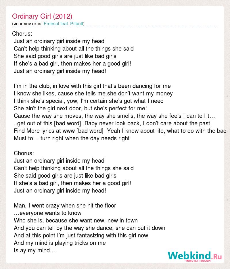 Chorus: Just an ordinary girl inside my head Can’t help thinking about all the things she said She said good girls are just like bad girls If she’s a bad girl, then makes her a good girl! Just an ordinary girl inside my head! I’m in the club, in love with this girl that’s been dancing for me I know she likes, cause she tells me she don’t want my money I think she’s special, yow, I‘m certain she’s got what I need She ain’t the girl next door, but she’s perfect for me! Cause the way she moves, the way she smells, the way she feels I can tell it… ..get out of this [bad word] Baby never look back, I don’t care about the past Find More lyrics at www [bad word] Yeah I know about life, what to do with the bad Must to… turn right when the day needs right Chorus: Just an ordinary girl inside my head Can’t help thinking about all the things she said She said good girls are just like bad girls If she’s a bad girl, then makes her a good girl! Just an ordinary girl inside my head! Man, I went crazy when she hit the floor …everyone wants to know Who she is, because she want new, new in town And you can tell by the way she dance, she can put it down And at this point I’m just fantasizing with this girl now And my mind is playing tricks on me Is ay my mind….