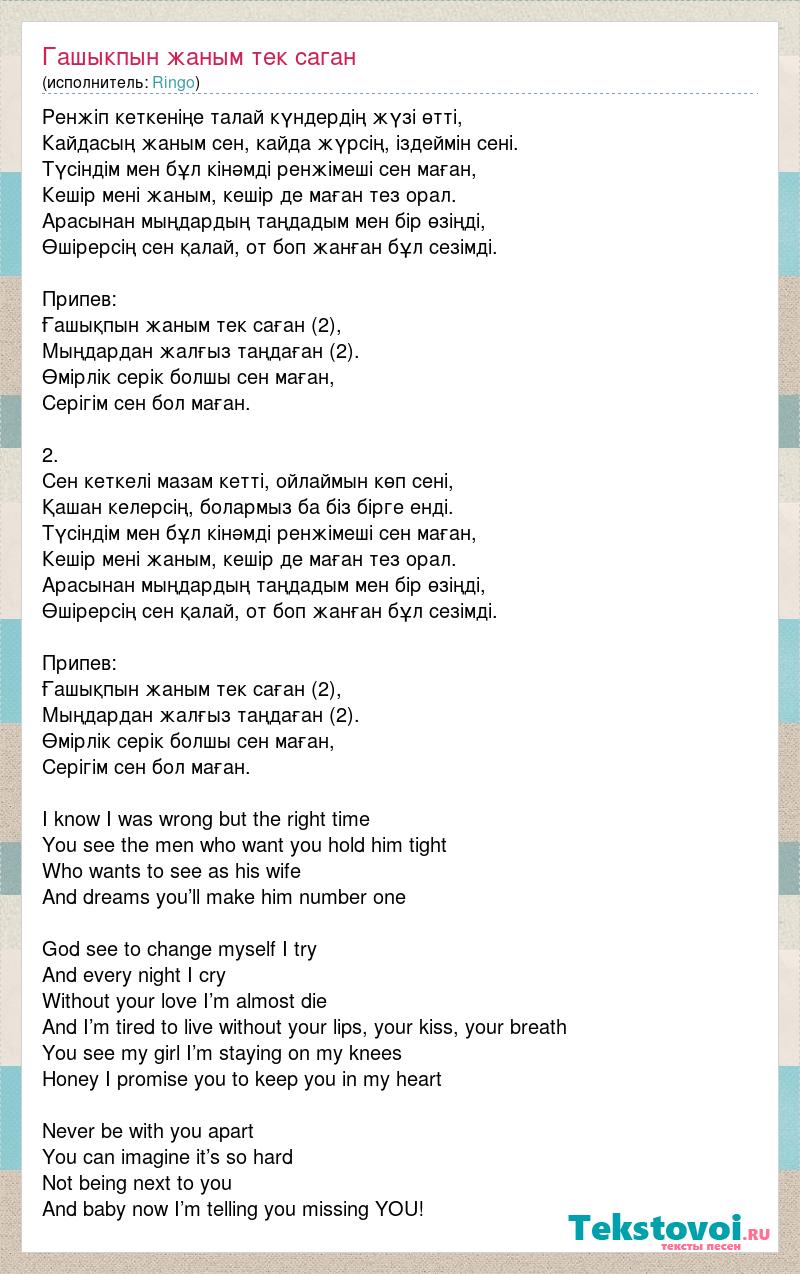 Ренжіп кеткеніңе талай күндердің жүзі өтті, Кайдасың жаным сен, кайда жүрсің, іздеймін сені. Түсіндім мен бұл кінәмді ренжімеші сен маған, Кешір мені жаным, кешір де маған тез орал. Арасынан мыңдардың таңдадым мен бір өзіңді, Өшірерсің сен қалай, от боп жанған бұл сезімді. Припев: Ғашықпын жаным тек саған (2), Мыңдардан жалғыз таңдаған (2). Өмірлік серік болшы сен маған, Серігім сен бол маған. 2. Сен кеткелі мазам кетті, ойлаймын көп сені, Қашан келерсің, болармыз ба біз бірге енді. Түсіндім мен бұл кінәмді ренжімеші сен маған, Кешір мені жаным, кешір де маған тез орал. Арасынан мыңдардың таңдадым мен бір өзіңді, Өшірерсің сен қалай, от боп жанған бұл сезімді. Припев: Ғашықпын жаным тек саған (2), Мыңдардан жалғыз таңдаған (2). Өмірлік серік болшы сен маған, Серігім сен бол маған. I know I was wrong but the right time You see the men who want you hold him tight Who wants to see as his wife And dreams you’ll make him number one God see to change myself I try And every night I cry Without your love I’m almost die And I’m tired to live without your lips, your kiss, your breath You see my girl I’m staying on my knees Honey I promise you to keep you in my heart Never be with you apart You can imagine it’s so hard Not being next to you And baby now I’m telling you missing YOU!