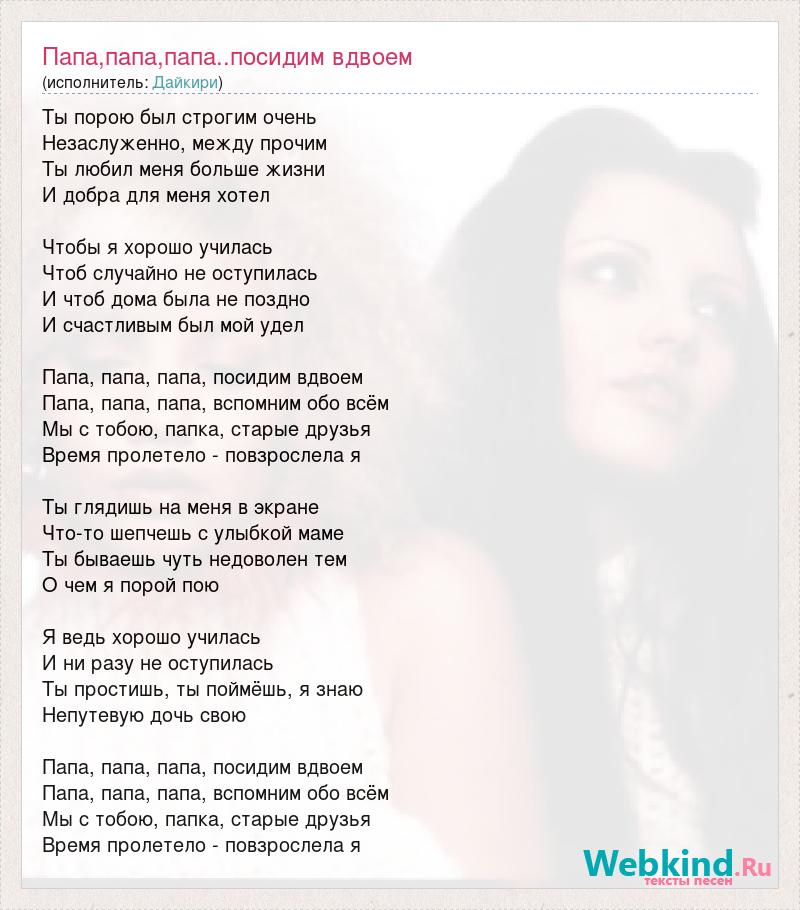 Ты порою был строгим очень Незаслуженно, между прочим Ты любил меня больше жизни И добра для меня хотел Чтобы я хорошо училась Чтоб случайно не оступилась И чтоб дома была не поздно И счастливым был мой удел Папа, папа, папа, посидим вдвоем Папа, папа, папа, вспомним обо всём Мы с тобою, папка, старые друзья Время пролетело - повзрослела я Ты глядишь на меня в экране Что-то шепчешь с улыбкой маме Ты бываешь чуть недоволен тем О чем я порой пою Я ведь хорошо училась И ни разу не оступилась Ты простишь, ты поймёшь, я знаю Непутевую дочь свою Папа, папа, папа, посидим вдвоем Папа, папа, папа, вспомним обо всём Мы с тобою, папка, старые друзья Время пролетело - повзрослела я