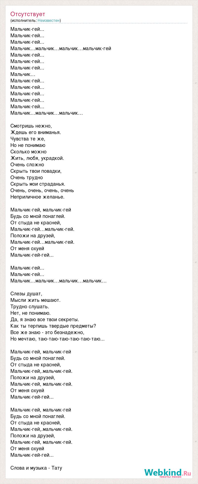 Мальчик-гей... Мальчик-гей... Мальчик-гей... Мальчик…мальчик…мальчик…мальчик-гей Мальчик-гей... Мальчик-гей... Мальчик-гей... Мальчик… Мальчик-гей... Мальчик-гей... Мальчик-гей... Мальчик-гей... Мальчик-гей... Мальчик…мальчик…мальчик… Смотришь нежно, Ждешь его вниманья. Чувства те же, Но не понимаю Сколько можно Жить, любя, украдкой. Очень сложно Скрыть твои повадки, Очень трудно Скрыть мои страданья. Очень, очень, очень, очень Неприличное желанье. Мальчик-гей, мальчик-гей Будь со мной понаглей. От стыда не красней, Мальчик-гей…мальчик-гей. Положи на друзей, Мальчик-гей…мальчик-гей. От меня охуей Мальчик-гей-гей... Мальчик-гей... Мальчик-гей... Мальчик…мальчик…мальчик…мальчик… Слезы душат, Мысли жить мешают. Трудно слушать. Нет, не понимаю. Да, я знаю все твои секреты. Как ты терпишь твердые предметы? Все же знаю - это безнадежно, Но мечтаю, таю-таю-таю-таю-таю-таю... Мальчик-гей, мальчик-гей Будь со мной понаглей. От стыда не красней, Мальчик-гей,.мальчик-гей. Положи на друзей, Мальчик-гей, мальчик-гей. От меня охуей Мальчик-гей-гей... Мальчик-гей, мальчик-гей Будь со мной понаглей. От стыда не красней, Мальчик-гей,.мальчик-гей. Положи на друзей, Мальчик-гей, мальчик-гей. От меня охуей Мальчик-гей-гей... Слова и музыка - Тату