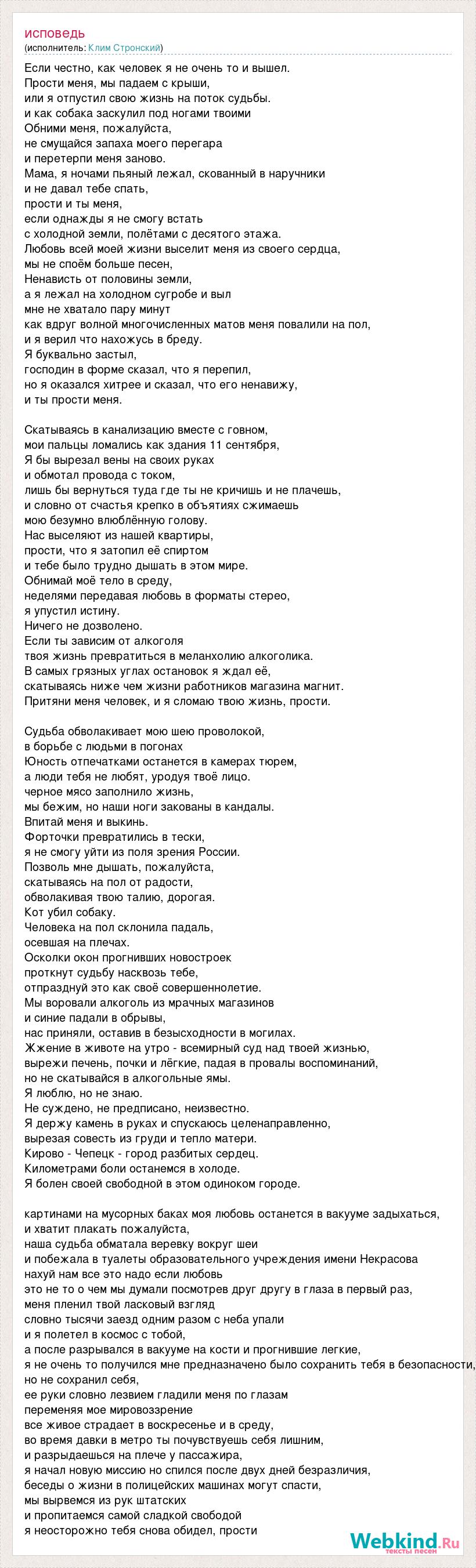 Если честно, как человек я не очень то и вышел. Прости меня, мы падаем с крыши, или я отпустил свою жизнь на поток судьбы. и как собака заскулил под ногами твоими Обними меня, пожалуйста, не смущайся запаха моего перегара и перетерпи меня заново. Мама, я ночами пьяный лежал, скованный в наручники и не давал тебе спать, прости и ты меня, если однажды я не смогу встать с холодной земли, полётами с десятого этажа. Любовь всей моей жизни выселит меня из своего сердца, мы не споём больше песен, Ненависть от половины земли, а я лежал на холодном сугробе и выл мне не хватало пару минут как вдруг волной многочисленных матов меня повалили на пол, и я верил что нахожусь в бреду. Я буквально застыл, господин в форме сказал, что я перепил, но я оказался хитрее и сказал, что его ненавижу, и ты прости меня. Скатываясь в канализацию вместе с говном, мои пальцы ломались как здания 11 сентября, Я бы вырезал вены на своих руках и обмотал провода с током, лишь бы вернуться туда где ты не кричишь и не плачешь, и словно от счастья крепко в объятиях сжимаешь мою безумно влюблённую голову. Нас выселяют из нашей квартиры, прости, что я затопил её спиртом и тебе было трудно дышать в этом мире. Обнимай моё тело в среду, неделями передавая любовь в форматы стерео, я упустил истину. Ничего не дозволено. Если ты зависим от алкоголя твоя жизнь превратиться в меланхолию алкоголика. В самых грязных углах остановок я ждал её, скатываясь ниже чем жизни работников магазина магнит. Притяни меня человек, и я сломаю твою жизнь, прости. Судьба обволакивает мою шею проволокой, в борьбе с людьми в погонах Юность отпечатками останется в камерах тюрем, а люди тебя не любят, уродуя твоё лицо. черное мясо заполнило жизнь, мы бежим, но наши ноги закованы в кандалы. Впитай меня и выкинь. Форточки превратились в тески, я не смогу уйти из поля зрения России. Позволь мне дышать, пожалуйста, скатываясь на пол от радости, обволакивая твою талию, дорогая. Кот убил собаку. Человека на пол склонила падаль, осевшая на плечах. Осколки окон прогнивших новостроек проткнут судьбу насквозь тебе, отпразднуй это как своё совершеннолетие. Мы воровали алкоголь из мрачных магазинов и синие падали в обрывы, нас приняли, оставив в безысходности в могилах. Жжение в животе на утро - всемирный суд над твоей жизнью, вырежи печень, почки и лёгкие, падая в провалы воспоминаний, но не скатывайся в алкогольные ямы. Я люблю, но не знаю. Не суждено, не предписано, неизвестно. Я держу камень в руках и спускаюсь целенаправленно, вырезая совесть из груди и тепло матери. Кирово - Чепецк - город разбитых сердец. Километрами боли останемся в холоде. Я болен своей свободной в этом одиноком городе. картинами на мусорных баках моя любовь останется в вакууме задыхаться, и хватит плакать пожалуйста, наша судьба обматала веревку вокруг шеи и побежала в туалеты образовательного учреждения имени Некрасова нахуй нам все это надо если любовь это не то о чем мы думали посмотрев друг другу в глаза в первый раз, меня пленил твой ласковый взгляд словно тысячи заезд одним разом с неба упали и я полетел в космос с тобой, а после разрывался в вакууме на кости и прогнившие легкие, я не очень то получился мне предназначено было сохранить тебя в безопасности, но не сохранил себя, ее руки словно лезвием гладили меня по глазам переменяя мое мировоззрение все живое 