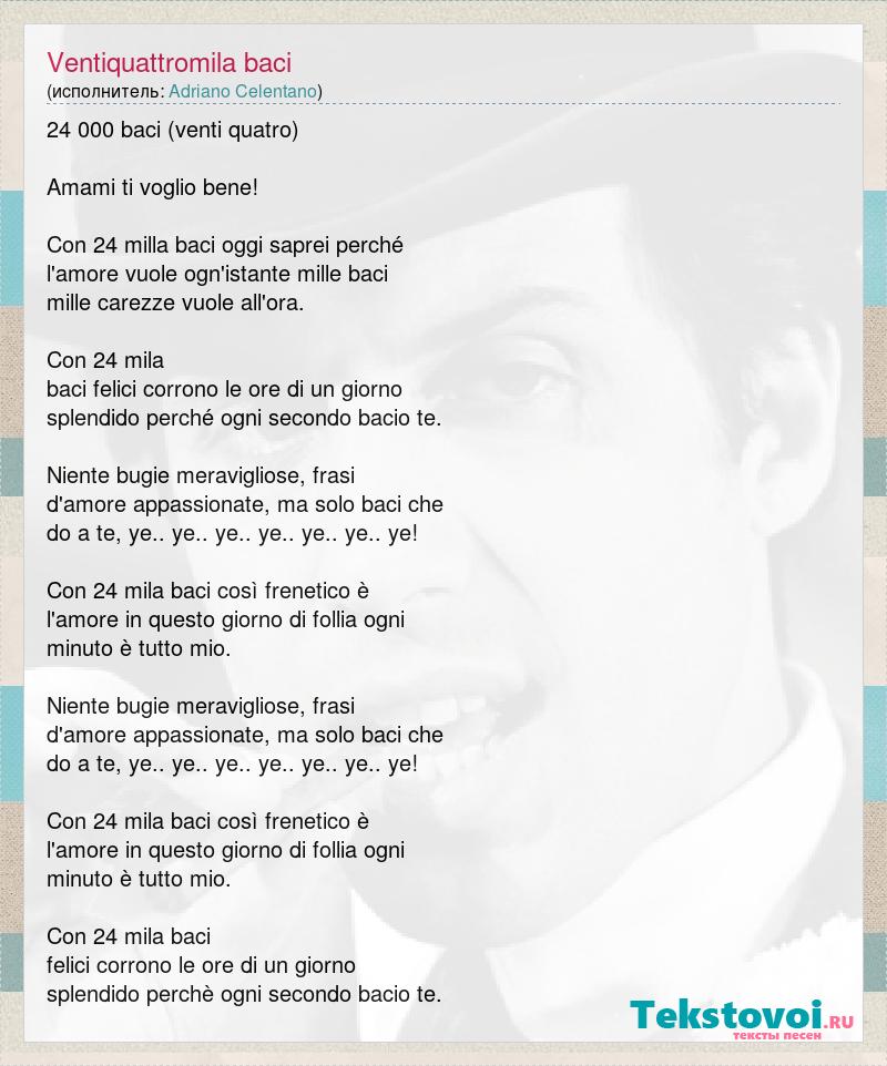 24 000 baci (venti quatro) Amami ti voglio bene! Con 24 milla baci oggi saprei perché l'amore vuole ogn'istante mille baci mille carezze vuole all'ora. Con 24 mila baci felici corrono le ore di un giorno splendido perché ogni secondo bacio te. Niente bugie meravigliose, frasi d'amore appassionate, ma solo baci che do a te, ye.. ye.. ye.. ye.. ye.. ye.. ye! Con 24 mila baci così frenetico è l'amore in questo giorno di follia ogni minuto è tutto mio. Niente bugie meravigliose, frasi d'amore appassionate, ma solo baci che do a te, ye.. ye.. ye.. ye.. ye.. ye.. ye! Con 24 mila baci così frenetico è l'amore in questo giorno di follia ogni minuto è tutto mio. Con 24 mila baci felici corrono le ore di un giorno splendido perchè ogni secondo bacio te.