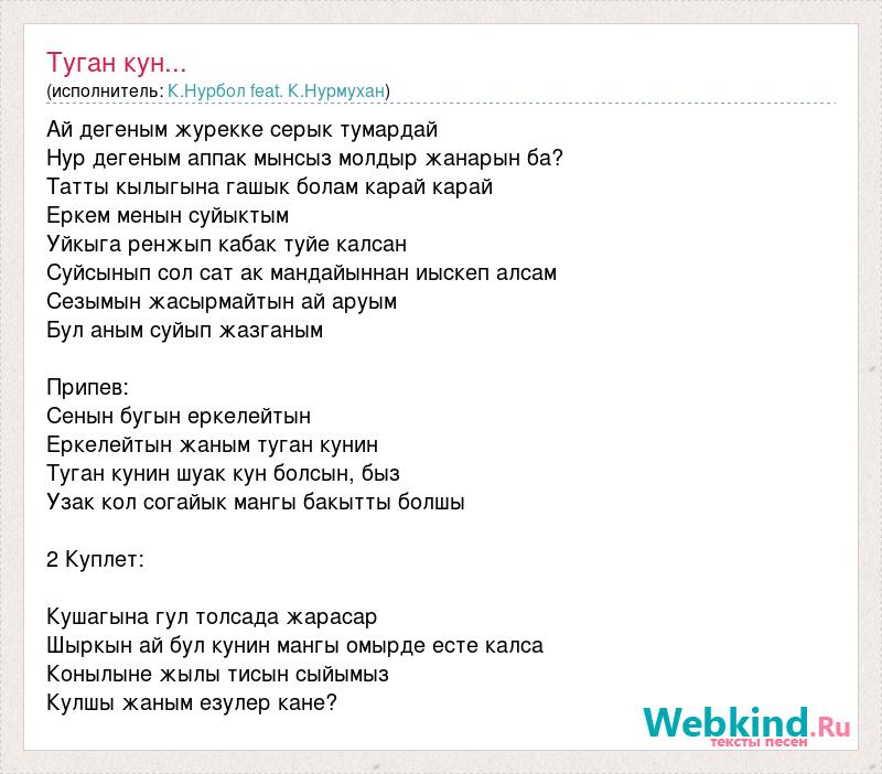 Ай дегеным журекке серык тумардай Нур дегеным аппак мынсыз молдыр жанарын ба? Татты кылыгына гашык болам карай карай Еркем менын суйыктым Уйкыга ренжып кабак туйе калсан Суйсынып сол сат ак мандайыннан иыскеп алсам Сезымын жасырмайтын ай аруым Бул аным суйып жазганым Припев: Сенын бугын еркелейтын Еркелейтын жаным туган кунин Туган кунин шуак кун болсын, быз Узак кол согайык мангы бакытты болшы 2 Куплет: Кушагына гул толсада жарасар Шыркын ай бул кунин мангы омырде есте калса Конылыне жылы тисын сыйымыз Кулшы жаным езулер кане?