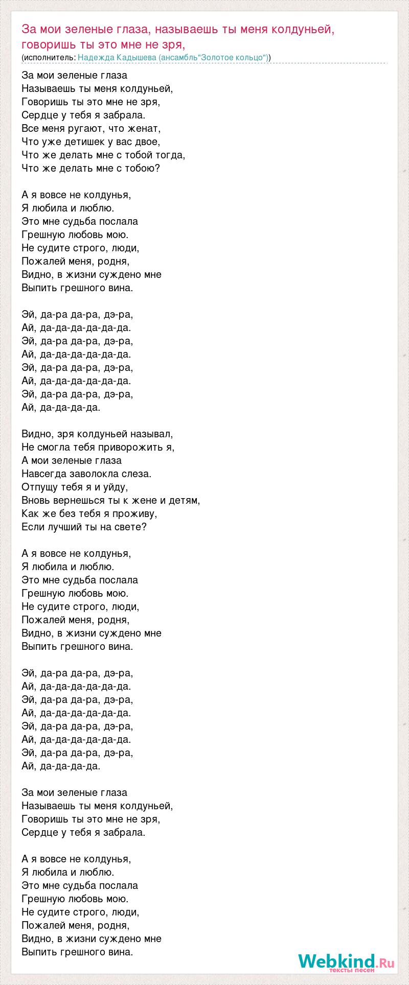 За мои зеленые глаза Называешь ты меня колдуньей, Говоришь ты это мне не зря, Сердце у тебя я забрала. Все меня ругают, что женат, Что уже детишек у вас двое, Что же делать мне с тобой тогда, Что же делать мне с тобою? А я вовсе не колдунья, Я любила и люблю. Это мне судьба послала Грешную любовь мою. Не судите строго, люди, Пожалей меня, родня, Видно, в жизни суждено мне Выпить грешного вина. Эй, да-ра да-ра, дэ-ра, Ай, да-да-да-да-да-да. Эй, да-ра да-ра, дэ-ра, Ай, да-да-да-да-да-да. Эй, да-ра да-ра, дэ-ра, Ай, да-да-да-да-да-да. Эй, да-ра да-ра, дэ-ра, Ай, да-да-да-да. Видно, зря колдуньей называл, Не смогла тебя приворожить я, А мои зеленые глаза Навсегда заволокла слеза. Отпущу тебя я и уйду, Вновь вернешься ты к жене и детям, Как же без тебя я проживу, Если лучший ты на свете? А я вовсе не колдунья, Я любила и люблю. Это мне судьба послала Грешную любовь мою. Не судите строго, люди, Пожалей меня, родня, Видно, в жизни суждено мне Выпить грешного вина. Эй, да-ра да-ра, дэ-ра, Ай, да-да-да-да-да-да. Эй, да-ра да-ра, дэ-ра, Ай, да-да-да-да-да-да. Эй, да-ра да-ра, дэ-ра, Ай, да-да-да-да-да-да. Эй, да-ра да-ра, дэ-ра, Ай, да-да-да-да. За мои зеленые глаза Называешь ты меня колдуньей, Говоришь ты это мне не зря, Сердце у тебя я забрала. А я вовсе не колдунья, Я любила и люблю. Это мне судьба послала Грешную любовь мою. Не судите строго, люди, Пожалей меня, родня, Видно, в жизни суждено мне Выпить грешного вина.