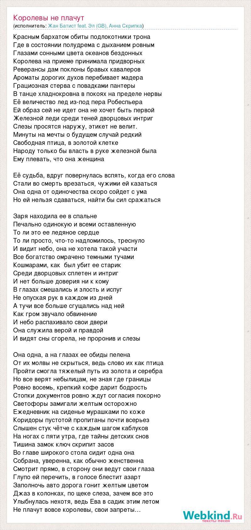Красным бархатом обиты подлокотники трона Где в состоянии полудрема с дыханием ровным Глазами сонными цвета океанов бездонных Королева на приеме принимала придворных Реверансы дам поклоны бравых кавалеров Ароматы дорогих духов перебивает мадера Грациозная стерва с повадками пантеры В танце хладнокровна в покоях на пределе нервы Её величество лед из-под пера Робеспьера Ей образ сей не идет она не хочет быть первой Железной леди среди теней дворцовых интриг Слезы просятся наружу, этикет не велит. Минуты на мечты о будущем случай редкий Свободная птица, в золотой клетке Народу только бы власть в руке железной была Ему плевать, что она женщина Её судьба, вдруг повернулась вспять, когда его слова Стали во смерть врезаться, чужими ей казаться Она одна от одиночества скоро сойдет с ума Но ей нельзя сдаваться, найти бы сил сражаться Заря находила ее в спальне Печально одинокую и всеми оставленную То ли это ее ледяное сердце То ли просто, что-то надломилось, треснуло И видит небо, она не хотела такой участи Все богатство омрачено темными тучами Кошмарами, как был убит ее старик Среди дворцовых сплетен и интриг И нет больше доверия ни к кому В глазах смешались и злость и испуг Не опуская рук в каждом из дней А тучи все больше сгущались над ней Как гром звучало обвинение И небо распахивало свои двери Она служила верой и правдой И видят сны сгорела, не проронив и слезы Она одна, а на глазах ее обиды пелена От их молвы не скрыться, ведь слово их как птица Пройти смогла тяжелый путь из золота и серебра Но все верят небылицам, не зная где границы Ровно восемь, крепкий кофе дарит бодрость Стопки документов ровно ждут согласия покорно Светофоры замигали желтым осторожно Ежедневник на сиденье мурашками по коже Коридоры пустотой пропитаны почти всерьез Слышен стук чётче с каждым шагом каблуков На ногах с пяти утра, где тайны детских снов Тишина замок ключ скрипит засов Во главе широкого стола сидит одна она Собрана, уверенна, как обычно женственна Смотрит прямо, в сторону они ведут свои глаза Глупо ей перечить, в голосе блестит азарт Заполночь авто дорога гонит желтым цветом Джаз в колонках, по щеке слеза, зачем все это Улыбнулась нехотя, ведь Ева в садик этим летом Не плачут вовсе королевы, свои запреты…