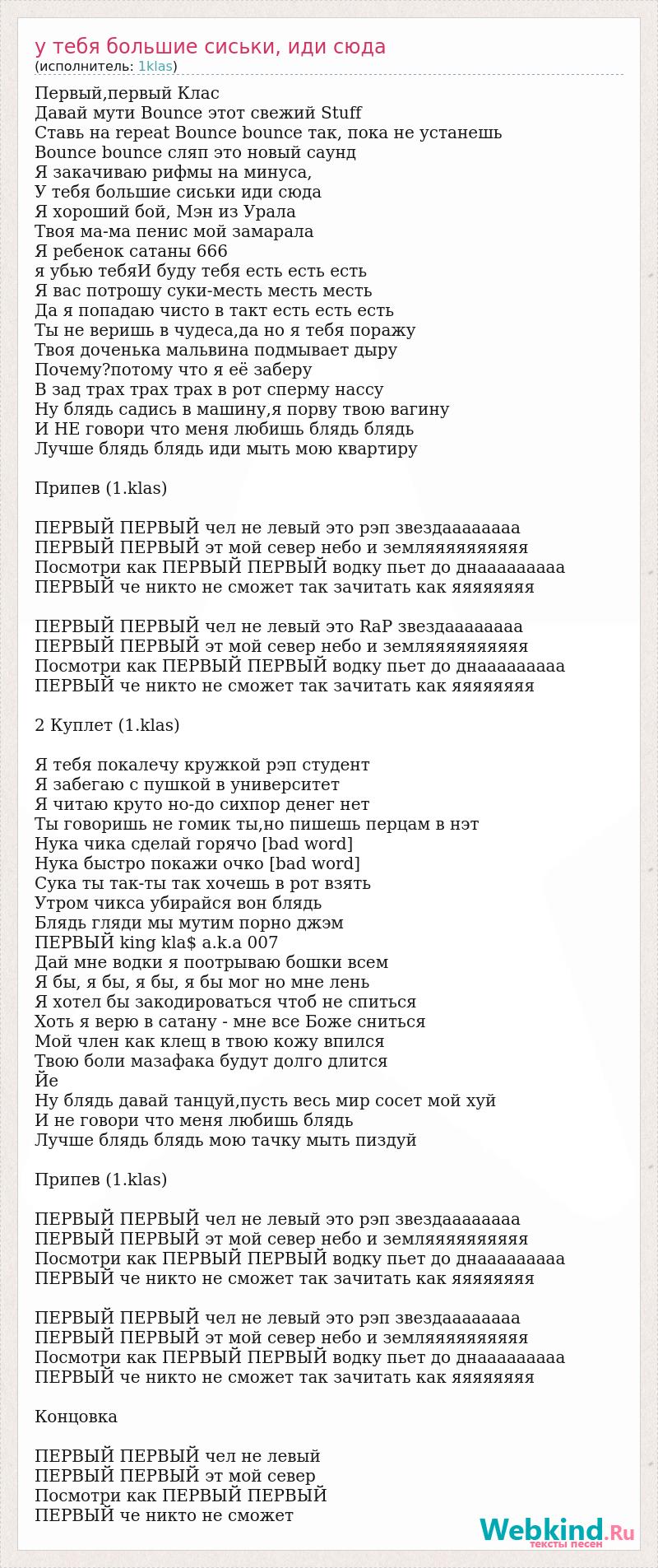 Первый,первый Клас Давай мути Bounce этот свежий Stuff Ставь на repeat Bounce bounce так, пока не устанешь Bounce bounce сляп это новый саунд Я закачиваю рифмы на минуса, У тебя большие сиськи иди сюда Я хороший бой, Мэн из Урала Твоя ма-ма пенис мой замарала Я ребенок сатаны 666 я убью тебяИ буду тебя есть есть есть Я вас потрошу суки-месть месть месть Да я попадаю чисто в такт есть есть есть Ты не веришь в чудеса,да но я тебя поражу Твоя доченька мальвина подмывает дыру Почему?потому что я её заберу В зад трах трах трах в рот сперму нассу Ну блядь садись в машину,я порву твою вагину И НЕ говори что меня любишь блядь блядь Лучше блядь блядь иди мыть мою квартиру Припев (1.klas) ПЕРВЫЙ ПЕРВЫЙ чел не левый это рэп звездаааааааа ПЕРВЫЙ ПЕРВЫЙ эт мой север небо и земляяяяяяяяяя Посмотри как ПЕРВЫЙ ПЕРВЫЙ водку пьет до днааааааааа ПЕРВЫЙ че никто не сможет так зачитать как яяяяяяяя ПЕРВЫЙ ПЕРВЫЙ чел не левый это RaP звездаааааааа ПЕРВЫЙ ПЕРВЫЙ эт мой север небо и земляяяяяяяяяя Посмотри как ПЕРВЫЙ ПЕРВЫЙ водку пьет до днааааааааа ПЕРВЫЙ че никто не сможет так зачитать как яяяяяяяя 2 Куплет (1.klas) Я тебя покалечу кружкой рэп студент Я забегаю с пушкой в университет Я читаю круто но-до сихпор денег нет Ты говоришь не гомик ты,но пишешь перцам в нэт Нука чика сделай горячо [bad word] Нука быстро покажи очко [bad word] Сука ты так-ты так хочешь в рот взять Утром чикса убирайся вон блядь Блядь гляди мы мутим порно джэм ПЕРВЫЙ king kla$ a.k.a 007 Дай мне водки я поотрываю бошки всем Я бы, я бы, я бы, я бы мог но мне лень Я хотел бы закодироваться чтоб не спиться Хоть я верю в сатану - мне все Боже сниться Мой член как клещ в твою кожу впился Твою боли мазафака будут долго длится Йе Ну блядь давай танцуй,пусть весь мир сосет мой хуй И не говори что меня любишь блядь Лучше блядь блядь мою тачку мыть пиздуй Припев (1.klas) ПЕРВЫЙ ПЕРВЫЙ чел не левый это рэп звездаааааааа ПЕРВЫЙ ПЕРВЫЙ эт мой север небо и земляяяяяяяяяя Посмотри как ПЕРВЫЙ ПЕРВЫЙ водку пьет до днааааааааа ПЕРВЫЙ че никто не сможет так зачитать как яяяяяяяя ПЕРВЫЙ ПЕРВЫЙ чел не левый это рэп звездаааааааа ПЕРВЫЙ ПЕРВЫЙ эт мой север небо и земляяяяяяяяяя Посмотри как ПЕРВЫЙ ПЕРВЫЙ водку пьет до днааааааааа ПЕРВЫЙ че никто не сможет так зачитать как яяяяяяяя Концовка ПЕРВЫЙ ПЕРВЫЙ чел не левый ПЕРВЫЙ ПЕРВЫЙ эт мой север Посмотри как ПЕРВЫЙ ПЕРВЫЙ ПЕРВЫЙ че никто не сможет