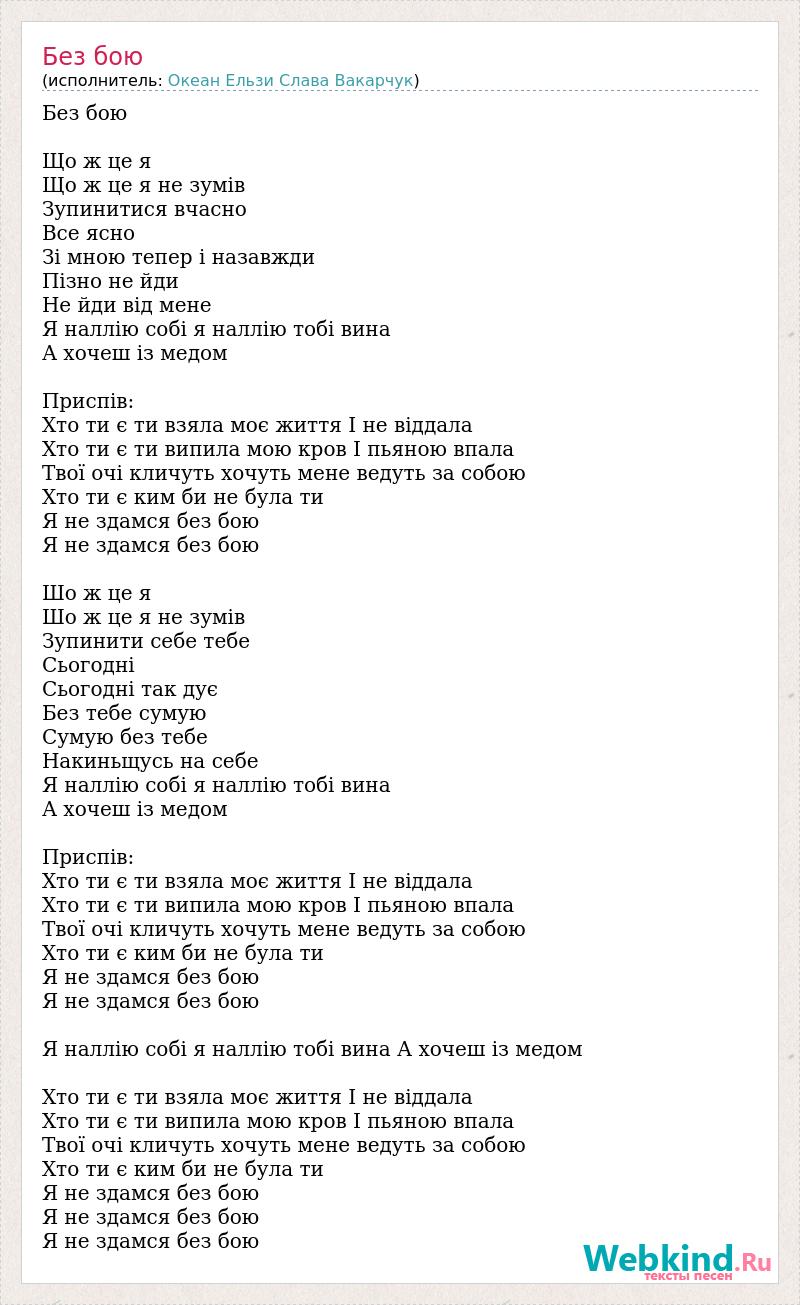 Без бою Що ж це я Що ж це я не зумів Зупинитися вчасно Все ясно Зі мною тепер і назавжди Пізно не йди Не йди від мене Я наллiю собі я наллiю тобі вина А хочеш із медом Приспів: Хто ти є ти взяла моє життя І не віддала Хто ти є ти випила мою кров І пьяною впала Твої очі кличуть хочуть мене ведуть за собою Хто ти є ким би не була ти Я не здамся без бою Я не здамся без бою Шо ж це я Шо ж це я не зумів Зупинити себе тебе Сьогодні Сьогодні так дує Без тебе сумую Сумую без тебе Накиньщусь на себе Я наллiю собі я наллiю тобі вина А хочеш із медом Приспів: Хто ти є ти взяла моє життя І не віддала Хто ти є ти випила мою кров І пьяною впала Твої очі кличуть хочуть мене ведуть за собою Хто ти є ким би не була ти Я не здамся без бою Я не здамся без бою Я наллiю собі я наллiю тобі вина А хочеш із медом Хто ти є ти взяла моє життя I не віддала Хто ти є ти випила мою кров І пьяною впала Твої очі кличуть хочуть мене ведуть за собою Хто ти є ким би не була ти Я не здамся без бою Я не здамся без бою Я не здамся без бою