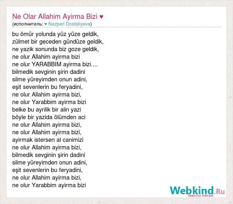 bu ömür yolunda yüz yüze geldik, zülmet bir geceden gündüze geldik, ne yazik sonunda biz goze geldik, ne olur Allahim ayirma bizi ne olur YARABBIM ayirma bizi.... bilmedik sevginin şirin dadini silme yüreyimden onun adini, eşit sevenlerin bu feryadini, ne olur Allahim ayirma bizi, ne olur Yarabbim ayirma bizi belke bu ayrilik bir alin yazi böyle bir yazida ölümden aci ne olur Allahim ayirma bizi, ne olur Allahim ayirma bizi, ayirmak istersen al canimizi ne olur Allahim ayirma bizi, bilmedik sevginin şirin dadini silme yüreyimden onun adini, eşit sevenlerin bu feryadini, ne olur Allahim ayirma bizi, ne olur Yarabbim ayirma bizi