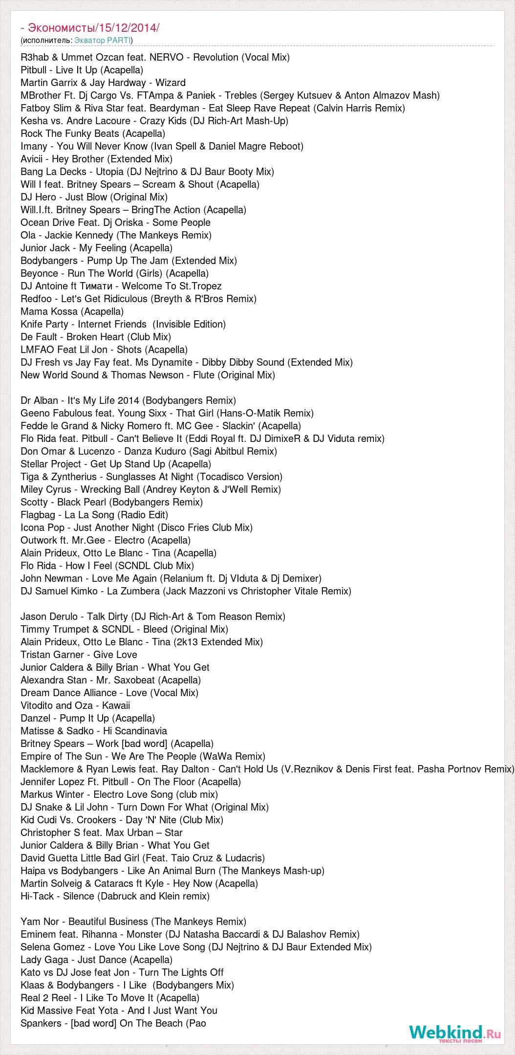R3hab & Ummet Ozcan feat. NERVO - Revolution (Vocal Mix) Pitbull - Live It Up (Acapella) Martin Garrix & Jay Hardway - Wizard MBrother Ft. Dj Cargo Vs. FTAmpa & Paniek - Trebles (Sergey Kutsuev & Anton Almazov Mash) Fatboy Slim & Riva Star feat. Beardyman - Eat Sleep Rave Repeat (Calvin Harris Remix) Kesha vs. Andre Lacoure - Crazy Kids (DJ Rich-Art Mash-Up) Rock The Funky Beats (Acapella) Imany - You Will Never Know (Ivan Spell & Daniel Magre Reboot) Avicii - Hey Brother (Extended Mix) Bang La Decks - Utopia (DJ Nejtrino & DJ Baur Booty Mix) Will I feat. Britney Spears – Scream & Shout (Acapella) DJ Hero - Just Blow (Original Mix) Will.I.ft. Britney Spears – BringThe Action (Acapella) Ocean Drive Feat. Dj Oriska - Some People Ola - Jackie Kennedy (The Mankeys Remix) Junior Jack - My Feeling (Acapella) Bodybangers - Pump Up The Jam (Extended Mix) Beyonce - Run The World (Girls) (Acapella) DJ Antoine ft Тимати - Welcome To St.Tropez Redfoo - Let's Get Ridiculous (Breyth & R'Bros Remix) Mama Kossa (Acapella) Knife Party - Internet Friends (Invisible Edition) De Fault - Broken Heart (Club Mix) LMFAO Feat Lil Jon - Shots (Acapella) DJ Fresh vs Jay Fay feat. Ms Dynamite - Dibby Dibby Sound (Extended Mix) New World Sound & Thomas Newson - Flute (Original Mix) Dr Alban - It's My Life 2014 (Bodybangers Remix) Geeno Fabulous feat. Young Sixx - That Girl (Hans-O-Matik Remix) Fedde le Grand & Nicky Romero ft. MC Gee - Slackin' (Acapella) Flo Rida feat. Pitbull - Can't Believe It (Eddi Royal ft. DJ DimixeR & DJ Viduta remix) Don Omar & Lucenzo - Danza Kuduro (Sagi Abitbul Remix) Stellar Project - Get Up Stand Up (Acapella) Tiga & Zyntherius - Sunglasses At Night (Tocadisco Version) Miley Cyrus - Wrecking Ball (Andrey Keyton & J'Well Remix) Scotty - Black Pearl (Bodybangers Remix) Flagbag - La La Song (Radio Edit) Icona Pop - Just Another Night (Disco Fries Club Mix) Outwork ft. Mr.Gee - Electro (Acapella) Alain Prideux, Otto Le Blanc - Tina (Acapella) Flo Rida - How I Feel (SCNDL Club Mix) John Newman - Love Me Again (Relanium ft. Dj VIduta & Dj Demixer) DJ Samuel Kimko - La Zumbera (Jack Mazzoni vs Christopher Vitale Remix) Jason Derulo - Talk Dirty (DJ Rich-Art & Tom Reason Remix) Timmy Trumpet & SCNDL - Bleed (Original Mix) Alain Prideux, Otto Le Blanc - Tina (2k13 Extended Mix) Tristan Garner - Give Love Junior Caldera & Billy Brian - What You Get Alexandra Stan - Mr. Saxobeat (Acapella) Dream Dance Alliance - Love (Vocal Mix) Vitodito and Oza - Kawaii Danzel - Pump It Up (Acapella) Matisse & Sadko - Hi Scandinavia Britney Spears – Work [bad word] (Acapella) Empire of The Sun - We Are The People (WaWa Remix) Macklemore & Ryan Lewis feat. Ray Dalton - Can't Hold Us (V.Reznikov & Denis First feat. Pasha Portnov Remix) Jennifer Lopez Ft. Pitbull - On The Floor (Acapella) Markus Winter - Electro Love Song (club mix) DJ Snake & Lil John - Turn Down For What (Original Mix) Kid Cudi Vs. Crookers - Day 'N' Nite (Club Mix) Christopher S feat. Max Urban – Star Junior Caldera & Billy Brian - What You Get David Guetta Little Bad Girl (Feat. Taio Cruz & Ludacris) Haipa vs Bodybangers - Like An Animal Burn (The Mankeys Mash-up) Martin Solveig & Cataracs ft Kyle - Hey Now (Acapella) Hi-Tack - Silence (Dabruck and Klein remix) Yam Nor - Beautiful Business (The Mankeys Remix) Eminem feat. Rihanna - Monster (DJ Natasha Baccardi & DJ Balashov Remix) Selena Gomez - Love You Like Love Song (DJ Nejtrino & DJ Baur Extended Mix) Lady Gaga - Just Dance (Acapella) Kato vs DJ Jose feat Jon - Turn The Lights Off Klaas & Bodybangers - I Like (Bodybangers Mix) Real 2 Reel - I Like To Move It (Acapella) Kid Massive Feat Yota - And I Just Want You Spankers - [bad word] On The Beach (Pao