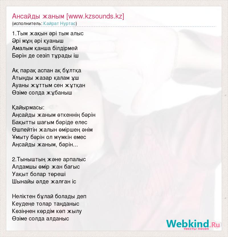 1.Тым жақын әрі тым алыс Әрі мұң әрі қуаныш Амалым қанша білдірмей Бәрін де сезіп тұрады іш Ақ парақ аспан ақ бұлтқа Атыңды жазар қалам ұш Ауаны жұттым сен жұтқан Өзіме солда жұбаныш Қайырмасы: Аңсайды жаным өткеннің бәрін Бақытты шағым бәріде елес Өшпейтін жалын өміршең әнім Ұмыту бәрін ол мүмкін емес Аңсайды жаным, бәрін... 2.Тыныштың және арпалыс Алдамшы өмір жан бағыс Уақыт болар төреші Шынайы әлде жалған іс Неліктен бұлай болады деп Кеудеңе толар таңданыс Көзіңнен көрдім көп жылу Өзіме солда алданыс