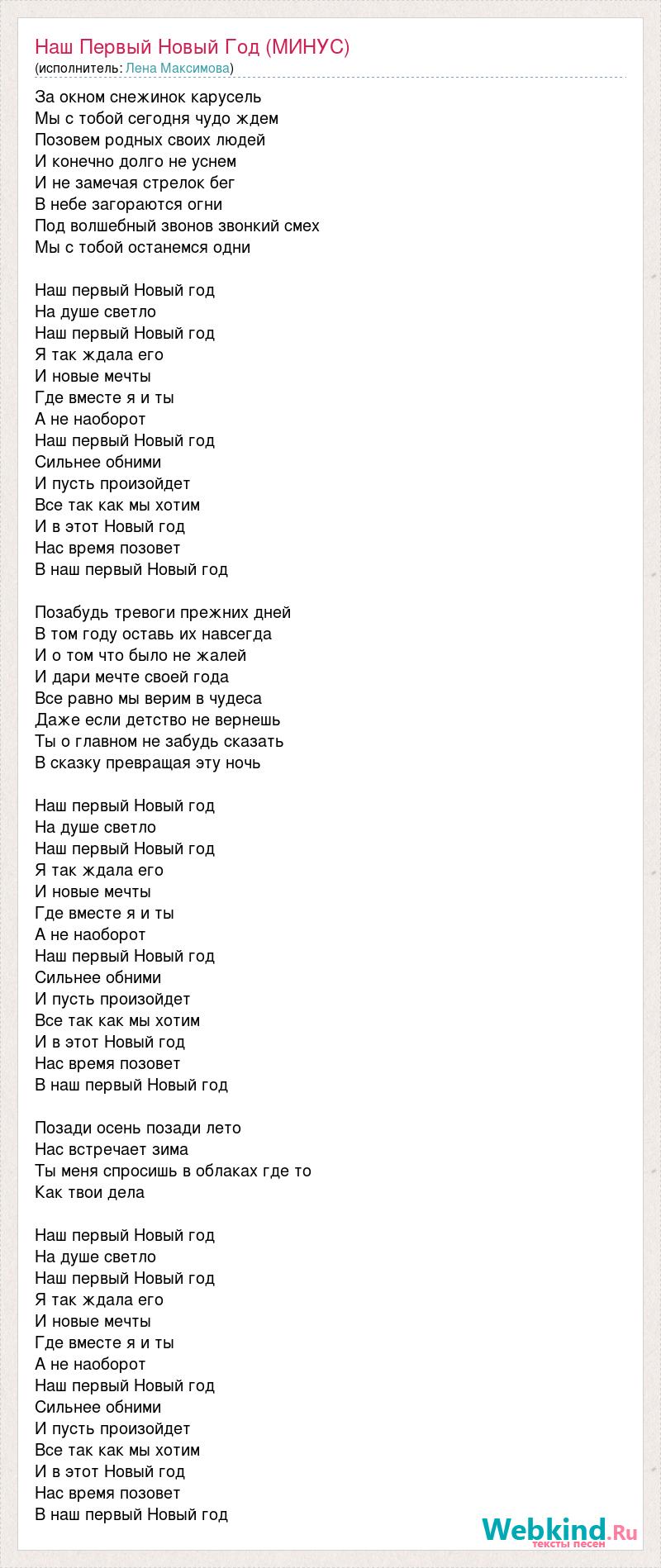 За окном снежинок карусель Мы с тобой сегодня чудо ждем Позовем родных своих людей И конечно долго не уснем И не замечая стрелок бег В небе загораются огни Под волшебный звонов звонкий смех Мы с тобой останемся одни Наш первый Новый год На душе светло Наш первый Новый год Я так ждала его И новые мечты Где вместе я и ты А не наоборот Наш первый Новый год Сильнее обними И пусть произойдет Все так как мы хотим И в этот Новый год Нас время позовет В наш первый Новый год Позабудь тревоги прежних дней В том году оставь их навсегда И о том что было не жалей И дари мечте своей года Все равно мы верим в чудеса Даже если детство не вернешь Ты о главном не забудь сказать В сказку превращая эту ночь Наш первый Новый год На душе светло Наш первый Новый год Я так ждала его И новые мечты Где вместе я и ты А не наоборот Наш первый Новый год Сильнее обними И пусть произойдет Все так как мы хотим И в этот Новый год Нас время позовет В наш первый Новый год Позади осень позади лето Нас встречает зима Ты меня спросишь в облаках где то Как твои дела Наш первый Новый год На душе светло Наш первый Новый год Я так ждала его И новые мечты Где вместе я и ты А не наоборот Наш первый Новый год Сильнее обними И пусть произойдет Все так как мы хотим И в этот Новый год Нас время позовет В наш первый Новый год