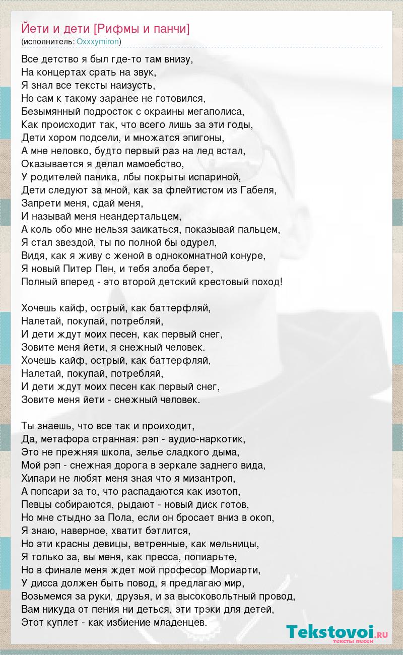 Все детство я был где-то там внизу, На концертах срать на звук, Я знал все тексты наизусть, Но сам к такому заранее не готовился, Безымянный подросток с окраины мегаполиса, Как происходит так, что всего лишь за эти годы, Дети хором подсели, и множатся эпигоны, А мне неловко, будто первый раз на лед встал, Оказывается я делал мамоебство, У родителей паника, лбы покрыты испариной, Дети следуют за мной, как за флейтистом из Габеля, Запрети меня, сдай меня, И называй меня неандертальцем, А коль обо мне нельзя заикаться, показывай пальцем, Я стал звездой, ты по полной бы одурел, Видя, как я живу с женой в однокомнатной конуре, Я новый Питер Пен, и тебя злоба берет, Полный вперед - это второй детский крестовый поход! Хочешь кайф, острый, как баттерфляй, Налетай, покупай, потребляй, И дети ждут моих песен, как первый снег, Зовите меня йети, я снежный человек. Хочешь кайф, острый, как баттерфляй, Налетай, покупай, потребляй, И дети ждут моих песен как первый снег, Зовите меня йети - снежный человек. Ты знаешь, что все так и проиходит, Да, метафора странная: рэп - аудио-наркотик, Это не прежняя школа, зелье сладкого дыма, Мой рэп - снежная дорога в зеркале заднего вида, Хипари не любят меня зная что я мизантроп, А попсари за то, что распадаются как изотоп, Певцы собираются, рыдают - новый диск готов, Но мне стыдно за Пола, если он бросает вниз в окоп, Я знаю, наверное, хватит бэтлится, Но эти красны девицы, ветренные, как мельницы, Я только за, вы меня, как пресса, попиарьте, Но в финале меня ждет мой професор Мориарти, У дисса должен быть повод, я предлагаю мир, Возьмемся за руки, друзья, и за высоковольтный провод, Вам никуда от пения ни деться, эти трэки для детей, Этот куплет - как избиение младенцев.