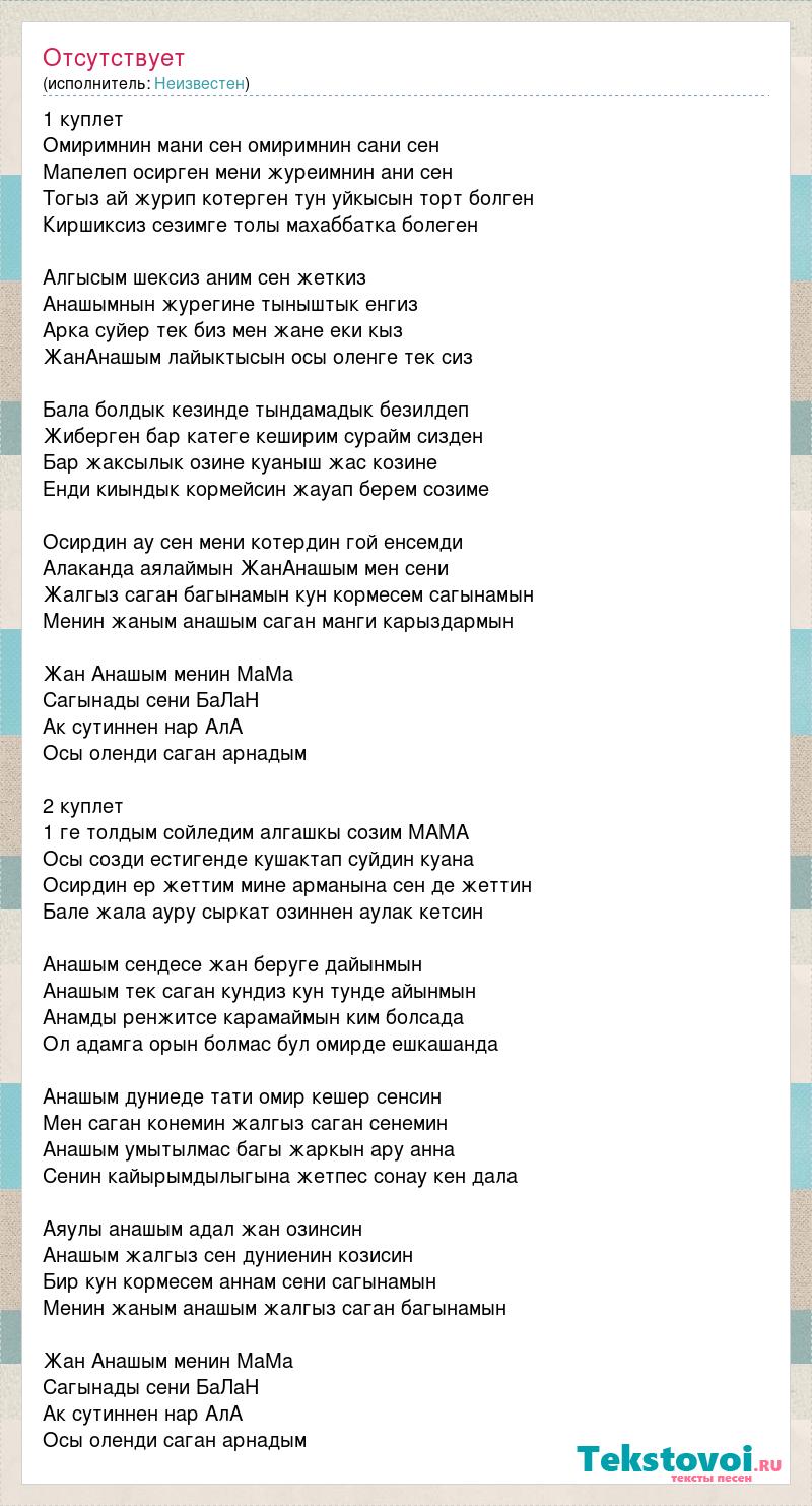 1 куплет Омиримнин мани сен омиримнин сани сен Мапелеп осирген мени журеимнин ани сен Тогыз ай журип котерген тун уйкысын торт болген Киршиксиз сезимге толы махаббатка болеген Алгысым шексиз аним сен жеткиз Анашымнын журегине тыныштык енгиз Арка суйер тек биз мен жане еки кыз ЖанАнашым лайыктысын осы оленге тек сиз Бала болдык кезинде тындамадык безилдеп Жиберген бар категе кеширим сурайм сизден Бар жаксылык озине куаныш жас козине Енди киындык кормейсин жауап берем созиме Осирдин ау сен мени котердин гой енсемди Алаканда аялаймын ЖанАнашым мен сени Жалгыз саган багынамын кун кормесем сагынамын Менин жаным анашым саган манги карыздармын Жан Анашым менин МаМа Сагынады сени БаЛаН Ак сутиннен нар АлА Осы оленди саган арнадым 2 куплет 1 ге толдым сойледим алгашкы созим МАМА Осы созди естигенде кушактап суйдин куана Осирдин ер жеттим мине арманына сен де жеттин Бале жала ауру сыркат озиннен аулак кетсин Анашым сендесе жан беруге дайынмын Анашым тек саган кундиз кун тунде айынмын Анамды ренжитсе карамаймын ким болсада Ол адамга орын болмас бул омирде ешкашанда Анашым дуниеде тати омир кешер сенсин Мен саган конемин жалгыз саган сенемин Анашым умытылмас багы жаркын ару анна Сенин кайырымдылыгына жетпес сонау кен дала Аяулы анашым адал жан озинсин Анашым жалгыз сен дуниенин козисин Бир кун кормесем аннам сени сагынамын Менин жаным анашым жалгыз саган багынамын Жан Анашым менин МаМа Сагынады сени БаЛаН Ак сутиннен нар АлА Осы оленди саган арнадым