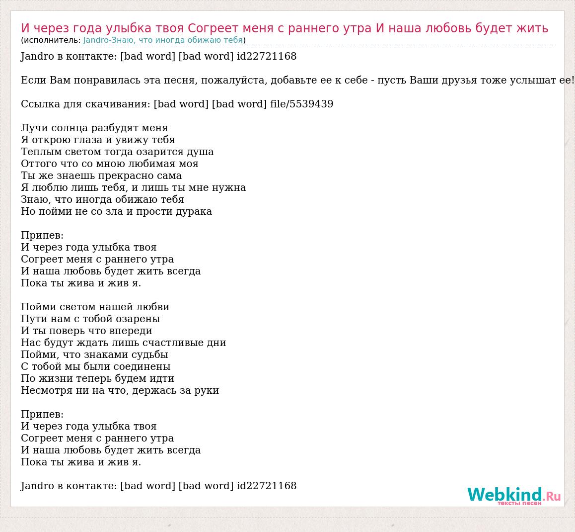 Jandro в контакте: [bad word] [bad word] id22721168 Если Вам понравилась эта песня, пожалуйста, добавьте ее к себе - пусть Ваши друзья тоже услышат ее! Ссылка для скачивания: [bad word] [bad word] file/5539439 Лучи солнца разбудят меня Я открою глаза и увижу тебя Теплым светом тогда озарится душа Оттого что со мною любимая моя Ты же знаешь прекрасно сама Я люблю лишь тебя, и лишь ты мне нужна Знаю, что иногда обижаю тебя Но пойми не со зла и прости дурака Припев: И через года улыбка твоя Согреет меня с раннего утра И наша любовь будет жить всегда Пока ты жива и жив я. Пойми светом нашей любви Пути нам с тобой озарены И ты поверь что впереди Нас будут ждать лишь счастливые дни Пойми, что знаками судьбы С тобой мы были соединены По жизни теперь будем идти Несмотря ни на что, держась за руки Припев: И через года улыбка твоя Согреет меня с раннего утра И наша любовь будет жить всегда Пока ты жива и жив я. Jandro в контакте: [bad word] [bad word] id22721168
