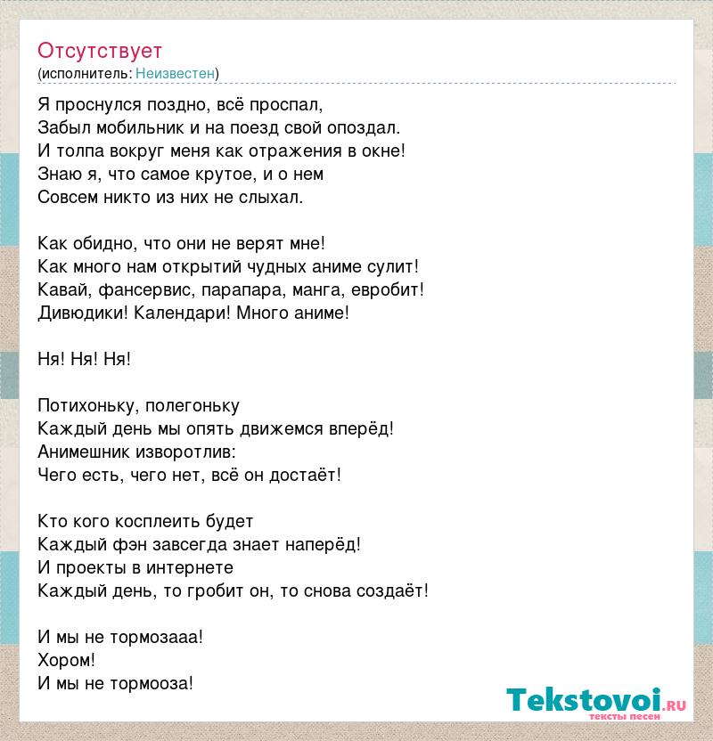 Я проснулся поздно, всё проспал, Забыл мобильник и на поезд свой опоздал. И толпа вокруг меня как отражения в окне! Знаю я, что самое крутое, и о нем Совсем никто из них не слыхал. Как обидно, что они не верят мне! Как много нам открытий чудных аниме сулит! Кавай, фансервис, парапара, манга, евробит! Дивюдики! Календари! Много аниме! Ня! Ня! Ня! Потихоньку, полегоньку Каждый день мы опять движемся вперёд! Анимешник изворотлив: Чего есть, чего нет, всё он достаёт! Кто кого косплеить будет Каждый фэн завсегда знает наперёд! И проекты в интернете Каждый день, то гробит он, то снова создаёт! И мы не тормозааа! Хором! И мы не тормооза!
