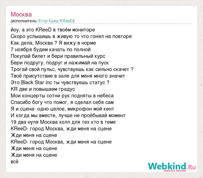 йоу, а это KReeD в твоём мониторе Скоро услышишь в живую то что гонял на повторе Как дела, Москва ? Я вижу в норме 7 ноября будем качать по полной Покупай билет и бери правильный курс Бери подругу, подруг и нажимай на пуск Трогай свой пульс, чувствуешь как сильно скачет ? Твоё присутствие в зале для меня много значит Это Black Star inc ты чувствуешь статус ? KR две и повышаем градус Мои концерты сотни рук подняты в небеса Спасибо богу что помог, я сделал себя сам Я и сцена- одно целое, микрофон мой кент И когда мы вместе, лучше не проёбывай момент 19 два нуля Москва холл для тех кто в теме KReeD- город Москва, жди меня на сцене Жди меня на сцене KReeD- город Москва, жди меня на сцене Жди меня на сцене Жди меня на сцене всё