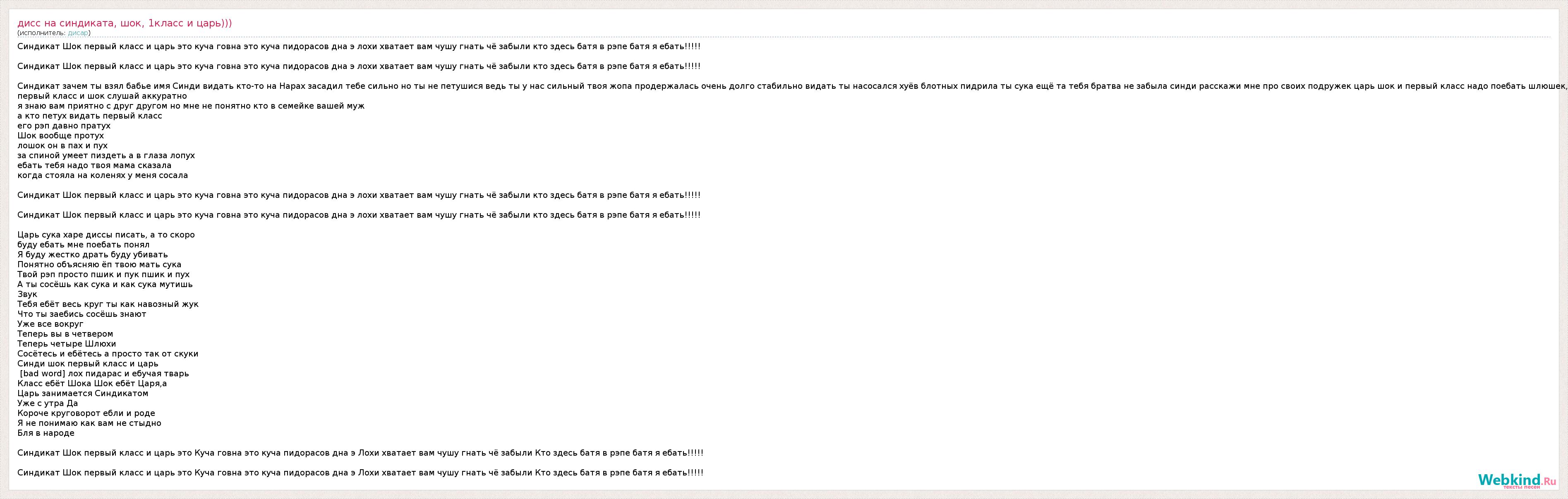 Синдикат Шок первый класс и царь это куча говна это куча пидорасов дна э лохи хватает вам чушу гнать чё забыли кто здесь батя в рэпе батя я ебать!!!!! Синдикат Шок первый класс и царь это куча говна это куча пидорасов дна э лохи хватает вам чушу гнать чё забыли кто здесь батя в рэпе батя я ебать!!!!! Синдикат зачем ты взял бабье имя Синди видать кто-то на Нарах засадил тебе сильно но ты не петушися ведь ты у нас сильный твоя жопа продержалась очень долго стабильно видать ты насосался хуёв блотных пидрила ты сука ещё та тебя братва не забыла синди расскажи мне про своих подружек царь шок и первый класс надо поебать шлюшек, первый класс и шок слушай аккуратно я знаю вам приятно с друг другом но мне не понятно кто в семейке вашей муж а кто петух видать первый класс его рэп давно пратух Шок вообще протух лошок он в пах и пух за спиной умеет пиздеть а в глаза лопух ебать тебя надо твоя мама сказала когда стояла на коленях у меня сосала Синдикат Шок первый класс и царь это куча говна это куча пидорасов дна э лохи хватает вам чушу гнать чё забыли кто здесь батя в рэпе батя я ебать!!!!! Синдикат Шок первый класс и царь это куча говна это куча пидорасов дна э лохи хватает вам чушу гнать чё забыли кто здесь батя в рэпе батя я ебать!!!!! Царь сука харе диссы писать, а то скоро буду ебать мне поебать понял Я буду жестко драть буду убивать Понятно объясняю ёп твою мать сука Твой рэп просто пшик и пук пшик и пух А ты сосёшь как сука и как сука мутишь Звук Тебя ебёт весь круг ты как навозный жук Что ты заебись сосёшь знают Уже все вокруг Теперь вы в четвером Теперь четыре Шлюхи Сосётесь и ебётесь а просто так от скуки Синди шок первый класс и царь [bad word] лох пидарас и ебучая тварь Класс ебёт Шока Шок ебёт Царя,а Царь занимается Синдикатом Уже с утра Да Короче круговорот ебли и роде Я не понимаю как вам не стыдно Бля в народе Синдикат Шок первый класс и царь это Куча говна это куча пидорасов дна э Лохи хватает вам чушу гнать чё забыли Кто здесь батя в рэпе батя я ебать!!!!! Синдикат Шок первый класс и царь это Куча говна это куча пидорасов дна э Лохи хватает вам чушу гнать чё забыли Кто здесь батя в рэпе батя я ебать!!!!!