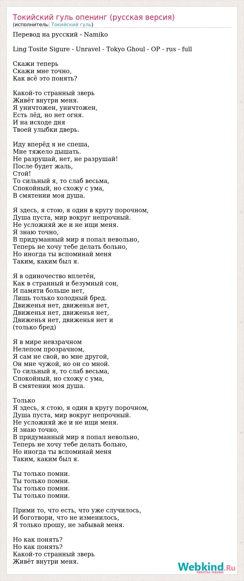 Перевод на русский - Namiko Ling Tosite Sigure - Unravel - Tokyo Ghoul - OP - rus - full Скажи теперь Скажи мне точно, Как всё это понять? Какой-то странный зверь Живёт внутри меня. Я уничтожен, уничтожен, Есть лёд, но нет огня. И на исходе дня Твоей улыбки дверь. Иду вперёд я не спеша, Мне тяжело дышать. Не разрушай, нет, не разрушай! После будет жаль, Стой! То сильный я, то слаб весьма, Спокойный, но схожу с ума, В смятении моя душа. Я здесь, я стою, я один в кругу порочном, Душа пуста, мир вокруг непрочный. Не усложняй же и не ищи меня. Я знаю точно, В придуманный мир я попал невольно, Теперь не хочу тебе делать больно, Но иногда ты вспоминай меня Таким, каким был я. Я в одиночество вплетён, Как в странный и безумный сон, И памяти больше нет, Лишь только холодный бред. Движенья нет, движенья нет, Движенья нет, движенья нет, Движенья нет, движенья нет и (только бред) Я в мире невзрачном Нелепом прозрачном, Я сам не свой, во мне другой, Он мне чужой, но он со мной. То сильный я, то слаб весьма, Спокойный, но схожу с ума, В смятении моя душа. Только Я здесь, я стою, я один в кругу порочном, Душа пуста, мир вокруг непрочный. Не усложняй же и не ищи меня. Я знаю точно, В придуманный мир я попал невольно, Теперь не хочу тебе делать больно, Но иногда ты вспоминай меня Таким, каким был я. Ты только помни. Ты только помни. Ты только помни. Ты только помни. Прими то, что есть, что уже случилось, И боготвори, что не изменилось, Я только прошу, не забывай меня. Но как понять? Но как понять? Какой-то странный зверь Живёт внутри меня.