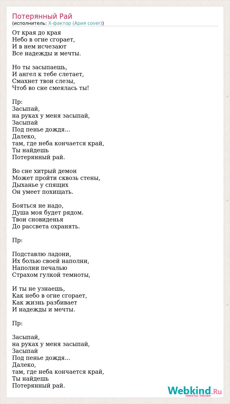 От края до края Небо в огне сгорает, И в нем исчезают Все надежды и мечты. Но ты засыпаешь, И ангел к тебе слетает, Смахнет твои слезы, Чтоб во сне смеялась ты! Пр: 3асыпай, на руках у меня засыпай, Засыпай Под пенье дождя... Далеко, там, где неба кончается край, Ты найдешь Потерянный рай. Во сне хитрый демон Может пройти сквозь стены, Дыханье у спящих Он умеет похищать. Бояться не надо, Душа моя будет рядом. Твои сновиденья До рассвета охранять. Пр: Подставлю ладони, Их болью своей наполни, Наполни печалью Страхом гулкой темноты, И ты не узнаешь, Как небо в огне сгорает, Как жизнь разбивает И надежды и мечты. Пр: 3асыпай, на руках у меня засыпай, Засыпай Под пенье дождя... Далеко, там, где неба кончается край, Ты найдешь Потерянный рай.