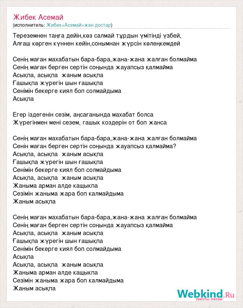 Тереземнен таңға дейін,көз салмай тұрдын үмітінді үзбей, Алғаш көрген күннен кейін,сонымнан жүрсін көлеңкемдей Сенің маған махабатын бара-бара,жана-жана жалған болмайма Сенің маған берген сертін соңында жауапсыз қалмайма Асықпа, асықпа жаным асықпа Ғашықпа жүрегін шын ғашықпа Сенімін бекерге киял боп солмайдыма Асықпа Егер іздегенін сезім, аңсағанында махабат болса Жүрегінмен мені сезем, гашык коздерін от боп жанса Сенің маған махабатын бара-бара,жана-жана жалған болмайма Сенін маған берген сертін соңында жауапсыз қалмайма? Асықпа, асықпа жаным асықпа Ғашықпа жүрегін шын ғашықпа Сенімін бекерге киял боп солмайдыма Асықпа, асықпа жаным асықпа Жаныма арман алде кащыкпа Сезімін жаныма жара боп калмайдыма Жаным асықпа Сенің маған махабатын бара-бара,жана-жана жалған болмайма Сенің маған берген сертін соңында жауапсыз қалмайма Асықпа, асықпа жаным асықпа Ғашықпа жүрегін шын ғашықпа Сенімін бекерге киял боп солмайдыма Асықпа Асықпа, асықпа жаным асықпа Жаныма арман алде кащыкпа Сезімін жаныма жара боп калмайдыма Жаным асықпа