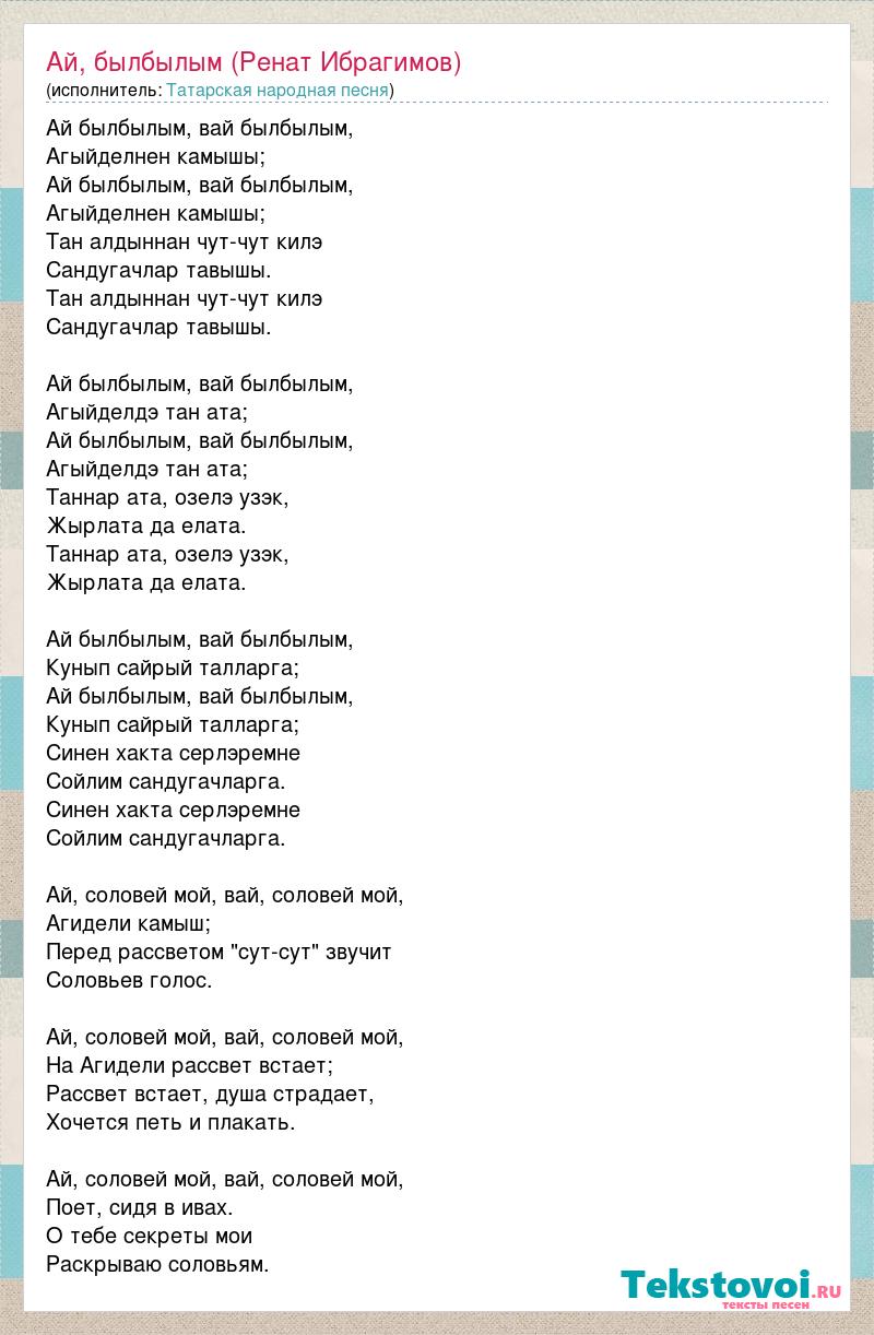 Ай былбылым, вай былбылым, Агыйделнен камышы; Ай былбылым, вай былбылым, Агыйделнен камышы; Тан алдыннан чут-чут килэ Сандугачлар тавышы. Тан алдыннан чут-чут килэ Сандугачлар тавышы. Ай былбылым, вай былбылым, Агыйделдэ тан ата; Ай былбылым, вай былбылым, Агыйделдэ тан ата; Таннар ата, озелэ узэк, Жырлата да елата. Таннар ата, озелэ узэк, Жырлата да елата. Ай былбылым, вай былбылым, Кунып сайрый талларга; Ай былбылым, вай былбылым, Кунып сайрый талларга; Синен хакта серлэремне Сойлим сандугачларга. Синен хакта серлэремне Сойлим сандугачларга. Ай, соловей мой, вай, соловей мой, Агидели камыш; Перед рассветом "сут-сут" звучит Соловьев голос. Ай, соловей мой, вай, соловей мой, На Агидели рассвет встает; Рассвет встает, душа страдает, Хочется петь и плакать. Ай, соловей мой, вай, соловей мой, Поет, сидя в ивах. О тебе секреты мои Раскрываю соловьям.