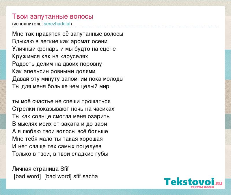 Мне так нравятся её запутанные волосы Вдыхаю в легкие как аромат осени Уличный фонарь и мы будто на сцене Кружимся как на каруселях Радость делим на двоих поровну Как апельсин ровными долями Давай эту минуту запомним пока молоды Ты для меня больше чем целый мир ты моё счастье не спеши прощаться Стрелки показывают ночь на часиках Ты как солнце смогла меня озарить В мыслях моих от заката и до зари А я люблю твои волосы всё больше Мне тебя мало ты такая хорошая И нет слаще тех самых поцелуев Только в твои, в твои сладкие губы Личная страница Sfif [bad word] [bad word] sfif.sacha