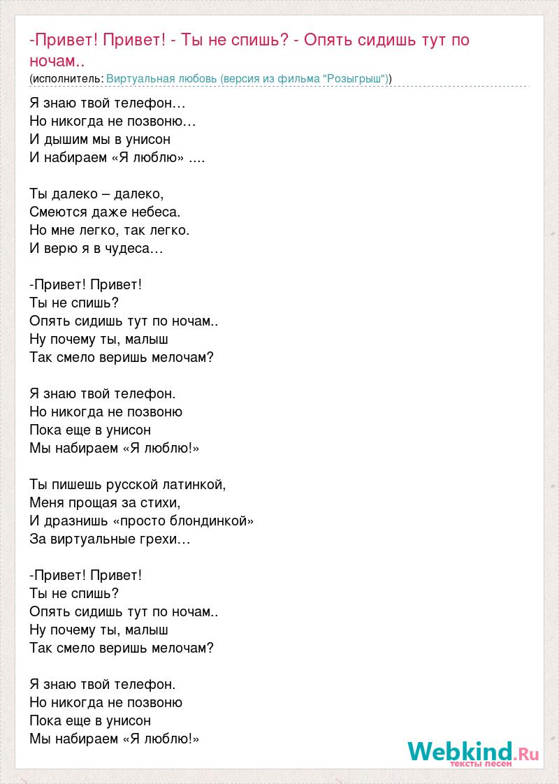 Я знаю твой телефон… Но никогда не позвоню… И дышим мы в унисон И набираем «Я люблю» .... Ты далеко – далеко, Смеются даже небеса. Но мне легко, так легко. И верю я в чудеса… -Привет! Привет! Ты не спишь? Опять сидишь тут по ночам.. Ну почему ты, малыш Так смело веришь мелочам? Я знаю твой телефон. Но никогда не позвоню Пока еще в унисон Мы набираем «Я люблю!» Ты пишешь русской латинкой, Меня прощая за стихи, И дразнишь «просто блондинкой» За виртуальные грехи… -Привет! Привет! Ты не спишь? Опять сидишь тут по ночам.. Ну почему ты, малыш Так смело веришь мелочам? Я знаю твой телефон. Но никогда не позвоню Пока еще в унисон Мы набираем «Я люблю!»