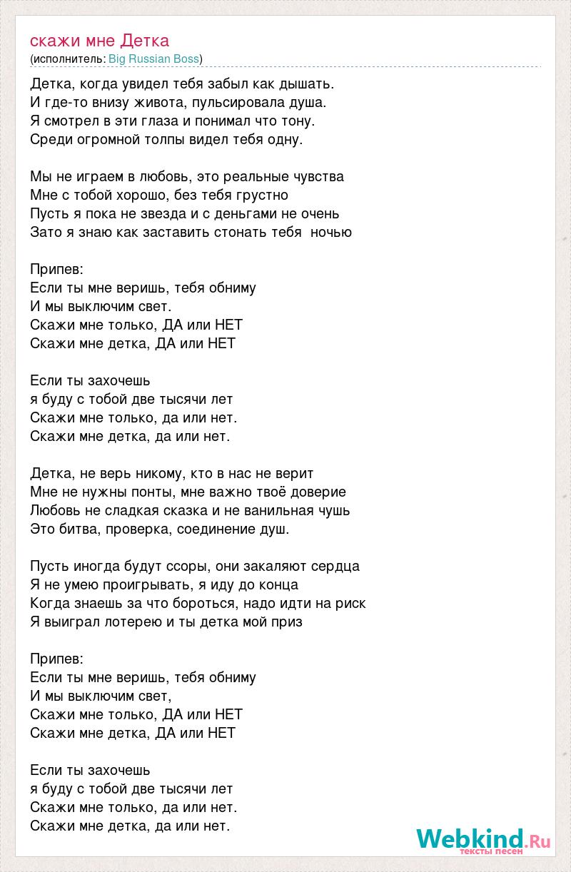 Детка, когда увидел тебя забыл как дышать. И где-то внизу живота, пульсировала душа. Я смотрел в эти глаза и понимал что тону. Среди огромной толпы видел тебя одну. Мы не играем в любовь, это реальные чувства Мне с тобой хорошо, без тебя грустно Пусть я пока не звезда и с деньгами не очень Зато я знаю как заставить стонать тебя ночью Припев: Если ты мне веришь, тебя обниму И мы выключим свет. Скажи мне только, ДА или НЕТ Скажи мне детка, ДА или НЕТ Если ты захочешь я буду с тобой две тысячи лет Скажи мне только, да или нет. Скажи мне детка, да или нет. Детка, не верь никому, кто в нас не верит Мне не нужны понты, мне важно твоё доверие Любовь не сладкая сказка и не ванильная чушь Это битва, проверка, соединение душ. Пусть иногда будут ссоры, они закаляют сердца Я не умею проигрывать, я иду до конца Когда знаешь за что бороться, надо идти на риск Я выиграл лотерею и ты детка мой приз Припев: Если ты мне веришь, тебя обниму И мы выключим свет, Скажи мне только, ДА или НЕТ Скажи мне детка, ДА или НЕТ Если ты захочешь я буду с тобой две тысячи лет Скажи мне только, да или нет. Скажи мне детка, да или нет.
