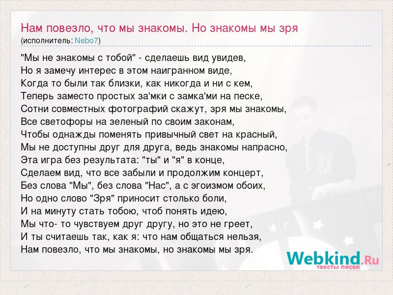 "Мы не знакомы с тобой" - сделаешь вид увидев, Но я замечу интерес в этом наигранном виде, Когда то были так близки, как никогда и ни с кем, Теперь заместо простых за'мки с замка'ми на песке, Сотни совместных фотографий скажут, зря мы знакомы, Все светофоры на зеленый по своим законам, Чтобы однажды поменять привычный свет на красный, Мы не доступны друг для друга, ведь знакомы напрасно, Эта игра без результата: "ты" и "я" в конце, Сделаем вид, что все забыли и продолжим концерт, Без слова "Мы", без слова "Нас", а с эгоизмом обоих, Но одно слово "Зря" приносит столько боли, И на минуту стать тобою, чтоб понять идею, Мы что- то чувствуем друг другу, но это не греет, И ты считаешь так, как я: что нам общаться нельзя, Нам повезло, что мы знакомы, но знакомы мы зря.