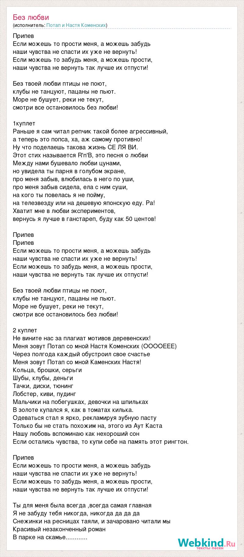 Припев Если можешь то прости меня, а можешь забудь наши чувства не спасти их уже не вернуть! Если можешь то забудь меня, а можешь прости, наши чувства не вернуть так лучше их отпусти! Без твоей любви птицы не поют, клубы не танцуют, пацаны не пьют. Море не бушует, реки не текут, смотри все остановилось без любви! 1куплет Раньше я сам читал репчик такой более агрессивный, а теперь это попса, ха, аж самому противно! Ну что поделаешь такова жизнь СЕ ЛЯ ВИ. Этот стих называется R'n'B, это песня о любви Между нами бушевало любви цунами, но увидела ты парня в голубом экране, про меня забыв, влюбилась в него по уши, про меня забыв сидела, ела с ним суши, на кого ты повелась я не пойму, на телезвезду или на дешевую японскую еду. Ра! Хватит мне в любви экспериментов, вернусь я лучше в ганстареп, буду как 50 центов! Припев Припев Если можешь то прости меня, а можешь забудь наши чувства не спасти их уже не вернуть! Если можешь то забудь меня, а можешь прости, наши чувства не вернуть так лучше их отпусти! Без твоей любви птицы не поют, клубы не танцуют, пацаны не пьют. Море не бушует, реки не текут, смотри все остановилось без любви! 2 куплет Не вините нас за плагиат мотивов деревенских! Меня зовут Потап со мной Настя Коменских (ООООЕЕЕ) Через полгода каждый обустроил свое счастье Меня зовут Потап со мной Каменских Настя! Кольца, брошки, серьги Шубы, клубы, деньги Тачки, диски, тюнинг Лобстер, киви, пудинг Мальчики на побегушках, девочки на шпильках В золоте купался я, как в томатах килька. Одеваться стал я ярко, рекламируя зубную пасту Только бы не стать похожим на, этого из Аут Каста Нашу любовь вспоминаю как нехороший сон Если остались чувства, то купи себе на память этот рингтон. Припев Если можешь то прости меня, а можешь забудь наши чувства не спасти их уже не вернуть! Если можешь то забудь меня, а можешь прости, наши чувства не вернуть так лучше их отпусти! Ты для меня была всегда ,всегда самая главная Я не забуду тебя никогда, никогда да да да Снежинки на ресницах таяли, и зачаровано читали мы Красивый незаконченный роман В парке на скамье............