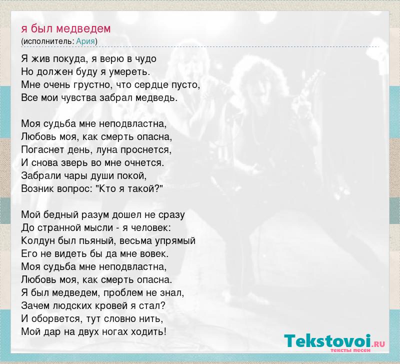 Я жив покуда, я верю в чудо Но должен буду я умереть. Мне очень грустно, что сердце пусто, Все мои чувства забрал медведь. Моя судьба мне неподвластна, Любовь моя, как смерть опасна, Погаснет день, луна проснется, И снова зверь во мне очнется. Забрали чары души покой, Возник вопрос: "Кто я такой?" Мой бедный разум дошел не сразу До странной мысли - я человек: Колдун был пьяный, весьма упрямый Его не видеть бы да мне вовек. Моя судьба мне неподвластна, Любовь моя, как смерть опасна. Я был медведем, проблем не знал, Зачем людских кровей я стал? И оборвется, тут словно нить, Мой дар на двух ногах ходить!