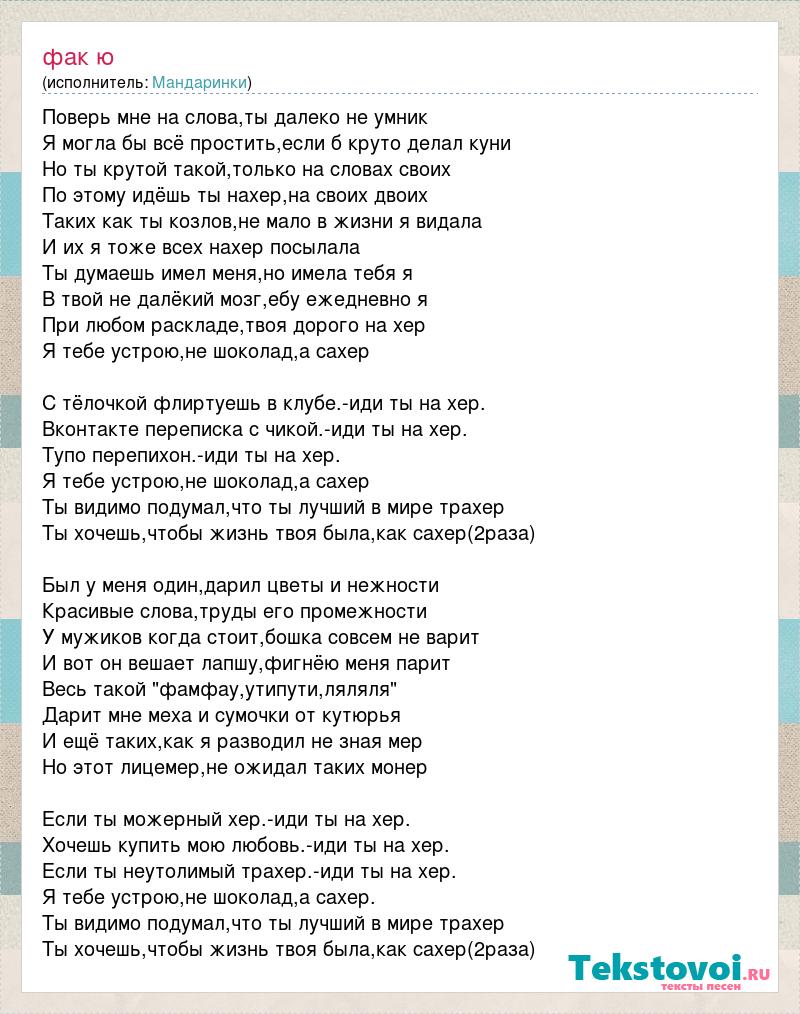 Поверь мне на слова,ты далеко не умник Я могла бы всё простить,если б круто делал куни Но ты крутой такой,только на словах своих По этому идёшь ты нахер,на своих двоих Таких как ты козлов,не мало в жизни я видала И их я тоже всех нахер посылала Ты думаешь имел меня,но имела тебя я В твой не далёкий мозг,ебу ежедневно я При любом раскладе,твоя дорого на хер Я тебе устрою,не шоколад,а сахер С тёлочкой флиртуешь в клубе.-иди ты на хер. Вконтакте переписка с чикой.-иди ты на хер. Тупо перепихон.-иди ты на хер. Я тебе устрою,не шоколад,а сахер Ты видимо подумал,что ты лучший в мире трахер Ты хочешь,чтобы жизнь твоя была,как сахер(2раза) Был у меня один,дарил цветы и нежности Красивые слова,труды его промежности У мужиков когда стоит,бошка совсем не варит И вот он вешает лапшу,фигнёю меня парит Весь такой "фамфау,утипути,ляляля" Дарит мне меха и сумочки от кутюрья И ещё таких,как я разводил не зная мер Но этот лицемер,не ожидал таких монер Если ты можерный хер.-иди ты на хер. Хочешь купить мою любовь.-иди ты на хер. Если ты неутолимый трахер.-иди ты на хер. Я тебе устрою,не шоколад,а сахер. Ты видимо подумал,что ты лучший в мире трахер Ты хочешь,чтобы жизнь твоя была,как сахер(2раза)