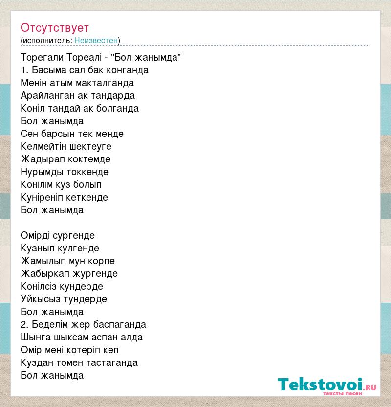 Торегали Тореалі - "Бол жанымда" 1. Басыма сал бак конганда Менін атым макталганда Арайланган ак тандарда Коніл тандай ак болганда Бол жанымда Сен барсын тек менде Келмейтін шектеуге Жадырап коктемде Нурымды токкенде Конілім куз болып Куніреніп кеткенде Бол жанымда Омірді сургенде Куанып кулгенде Жамылып мун корпе Жабыркап жургенде Конілсіз кундерде Уйкысыз тундерде Бол жанымда 2. Беделім жер баспаганда Шынга шыксам аспан алда Омір мені котеріп кеп Куздан томен тастаганда Бол жанымда