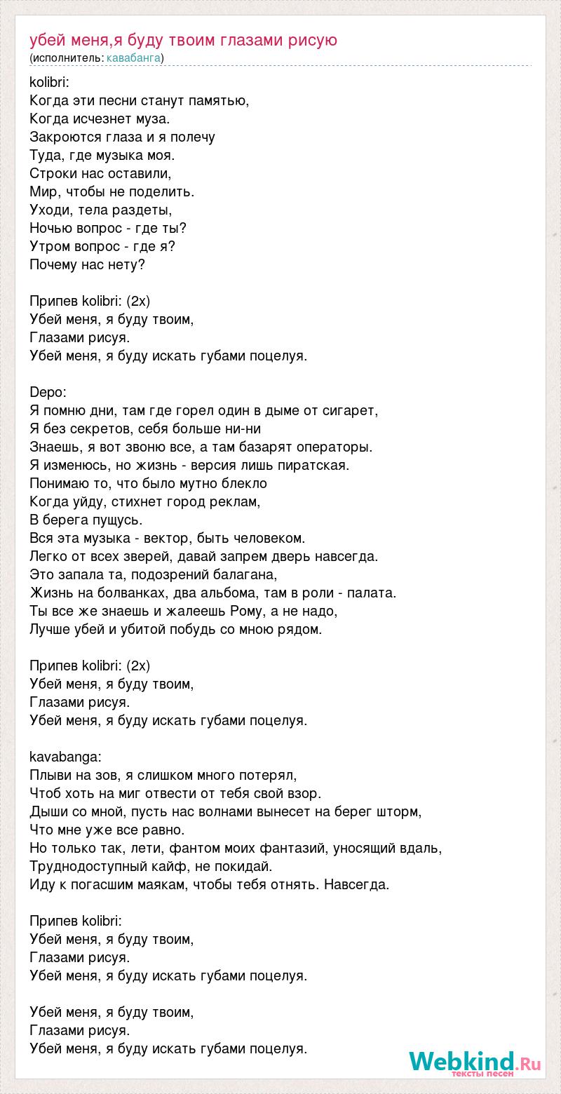 kolibri: Когда эти песни станут памятью, Когда исчезнет муза. Закроются глаза и я полечу Туда, где музыка моя. Строки нас оставили, Мир, чтобы не поделить. Уходи, тела раздеты, Ночью вопрос - где ты? Утром вопрос - где я? Почему нас нету? Припев kolibri: (2х) Убей меня, я буду твоим, Глазами рисуя. Убей меня, я буду искать губами поцелуя. Depo: Я помню дни, там где горел один в дыме от сигарет, Я без секретов, себя больше ни-ни Знаешь, я вот звоню все, а там базарят операторы. Я изменюсь, но жизнь - версия лишь пиратская. Понимаю то, что было мутно блекло Когда уйду, стихнет город реклам, В берега пущусь. Вся эта музыка - вектор, быть человеком. Легко от всех зверей, давай запрем дверь навсегда. Это запала та, подозрений балагана, Жизнь на болванках, два альбома, там в роли - палата. Ты все же знаешь и жалеешь Рому, а не надо, Лучше убей и убитой побудь со мною рядом. Припев kolibri: (2х) Убей меня, я буду твоим, Глазами рисуя. Убей меня, я буду искать губами поцелуя. kavabanga: Плыви на зов, я слишком много потерял, Чтоб хоть на миг отвести от тебя свой взор. Дыши со мной, пусть нас волнами вынесет на берег шторм, Что мне уже все равно. Но только так, лети, фантом моих фантазий, уносящий вдаль, Труднодоступный кайф, не покидай. Иду к погасшим маякам, чтобы тебя отнять. Навсегда. Припев kolibri: Убей меня, я буду твоим, Глазами рисуя. Убей меня, я буду искать губами поцелуя. Убей меня, я буду твоим, Глазами рисуя. Убей меня, я буду искать губами поцелуя.