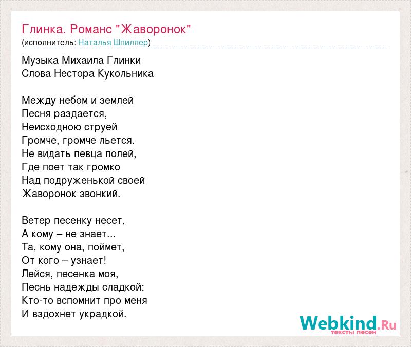 Музыка Михаила Глинки Слова Нестора Кукольника Между небом и землей Песня раздается, Неисходною струей Громче, громче льется. Не видать певца полей, Где поет так громко Над подруженькой своей Жаворонок звонкий. Ветер песенку несет, А кому – не знает... Та, кому она, поймет, От кого – узнает! Лейся, песенка моя, Песнь надежды сладкой: Кто-то вспомнит про меня И вздохнет украдкой.