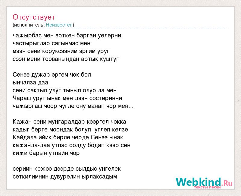 чажырбас мен эрткен барган уелерни частырыглар сагынмас мен мээн сени коруксээним эргим уруг сээн мени тоованындан артык куштуг Сенээ дужар эргем чок бол ынчалза даа сени сактып улуг тынып олур ла мен Чараш уруг ынак мен дээн состеринни чажыргаш чоор чугле ону манап чор мен... Кажан сени мунгаралдар кээргел чокка кадыг берге моондак болуп углеп келзе Кайдала ийик бирле черде Сенээ ынак кажанда-даа утпас оолду бодап кээр сен кижи барын утпайн чор сериин кежээ дээрде сылдыс унгелек сеткилимнин дувурелин ырлаксадым