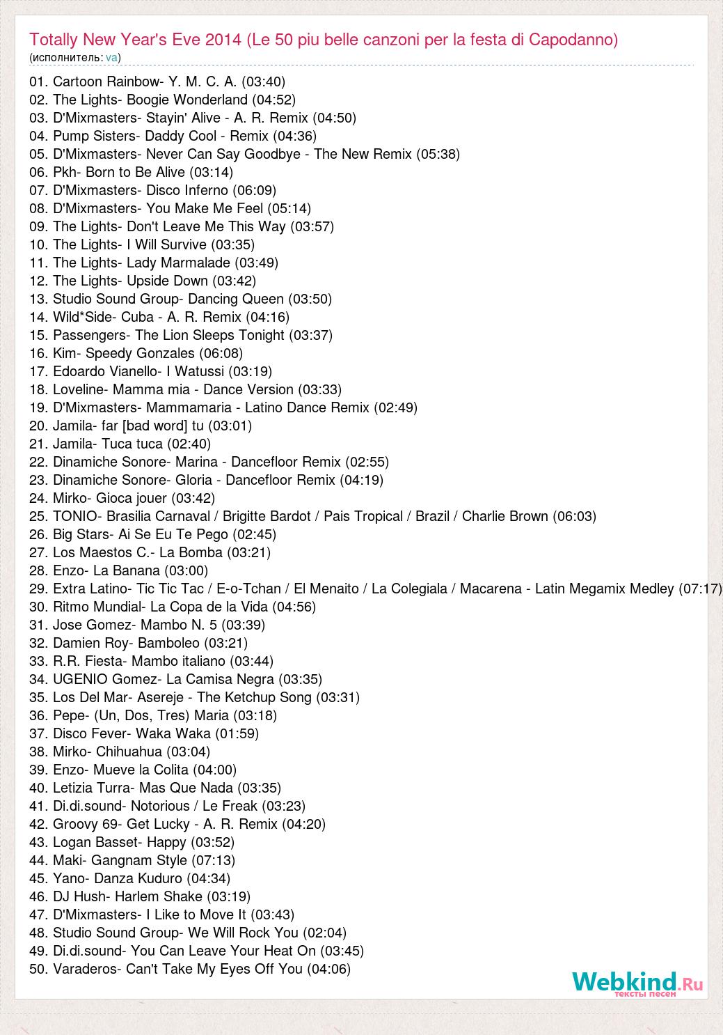 А как ты думаешь, о чем песня "Totally New Year's Eve 2014 (Le 50 piu belle canzoni per la festa di" ?